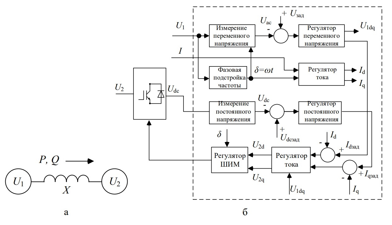 Управление активной и реактивной мощностью (в условиях симметричных токов и напряжений) осуществляется по выражению (обозначение по рис. 6) [10]: