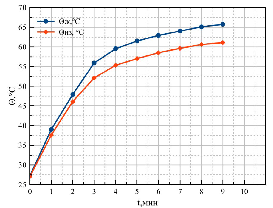 В ходе экспериментального исследования были получены зависимости изменения температуры провода с течением времени при различных углах. На рисунке 7 представлены изменения температуры жилы и изоляции при угле 90°, а на рисунке 8 – при угле 50°. Из представленных рисунков видно, что на 9 минуте разность между температурой жилы и температурой изоляции составляла от 4 до 8 °C, что соответствует ранее предложенным гипотезам.