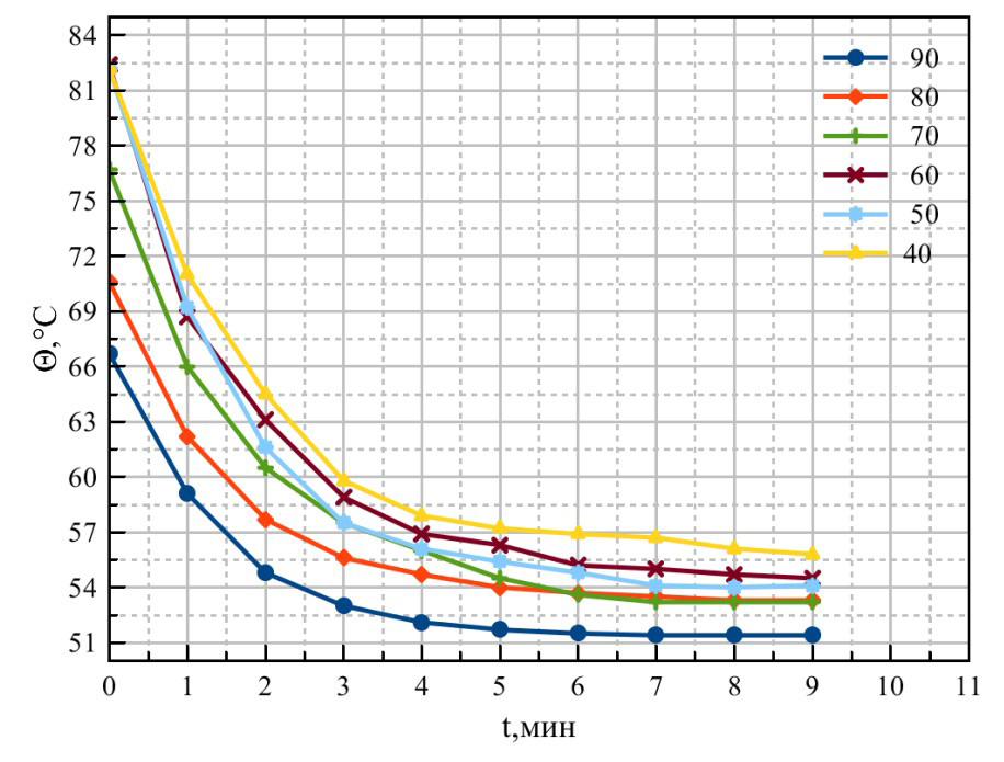 На рисунке 9 представлены графики изменения температуры при изменении угла атаки ветра. Из данного графика можно отметить, что при изменении направления ветра температура возрастает, а также можем сделать вывод о том, что на 9 минуте при углах 40 ° и 60 ° разность между температурой жилы и температурой изоляции незначительна и составляет не более 3 °C. С течением времени, при достижении стационарного режима, разность составляет не более 0,5 °C. Время достижения стационарного режима для каждого угла разное, поэтому был сделан срез на 9 минуте для большей наглядности.