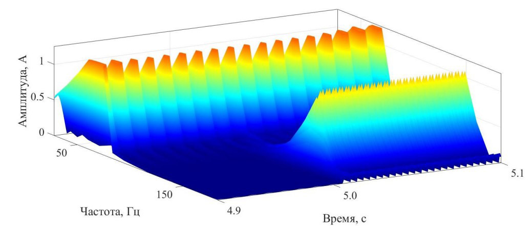 Применение вейвлет-преобразования позволяет получить информацию о сигнале в трехмерной интерпретации: амплитуда, время, частота. Вейвлет-преобразование успешно применено в работе [4] для анализа напряжения питающей сети промысловых судов и построения активных фильтров для повышения качества электроэнергии. Так, для сигнала тока, представленного на рисунке 2, в результате непрерывного вейвлет-преобразования получаем исчерпывающую информацию об амплитудно-частотных особенностях сигнала с четким разрешением по времени.
