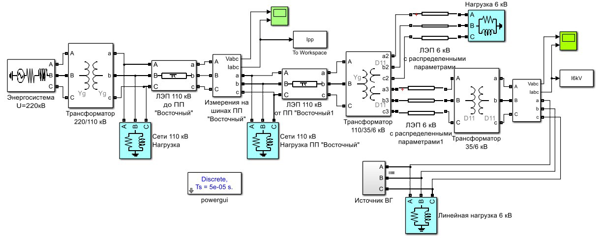 Имитационное моделирование режимов электрической сети 110/35/6 кВ произведем в среде моделирования Matlab Simulink (рисунок 6). Нелинейная нагрузка, являющаяся источником высших гармоник, представлена на стороне 6 кВ.