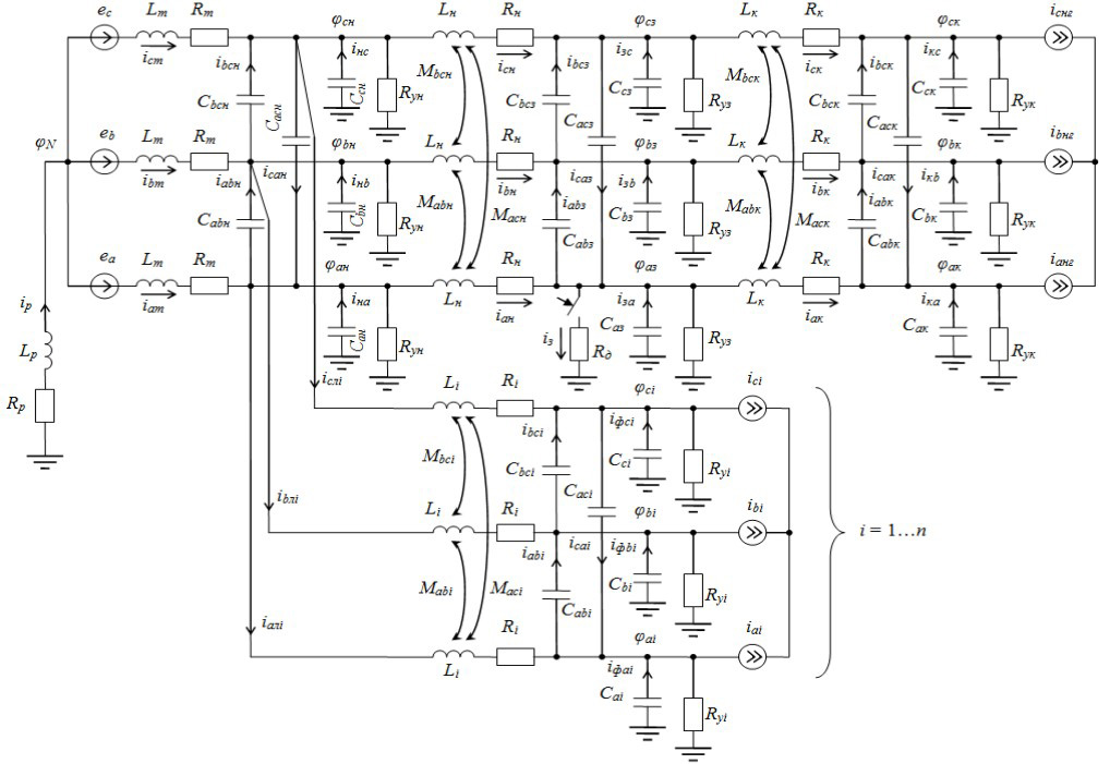 На первоначальном этапе исследования разработаем математическую модель для исследования электрической сети с компенсацией емкостных токов замыкания на землю с помощью дугогасительного реактора. Схему замещения представим в трехфазном исполнении с поперечными ветвями, моделирующими ёмкостную и активную проводимости, учитывая при этом магнитосвязанные цепи.