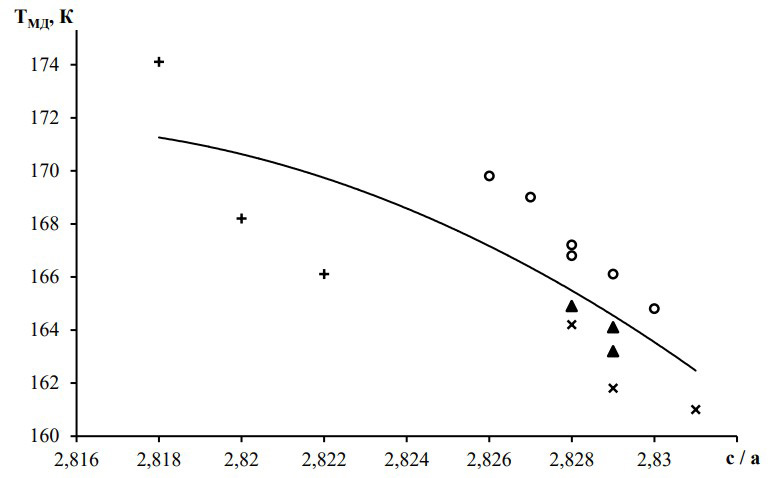 Рисунок 1 – Зависимость температуры фазового перехода от параметров кристаллической решётки для соединений V2±δ O3 (o), V2-δ Al0,02 O3 (+), V2-δFe0,02O3 (x), V2-δ Cr0,02O3 (▲)