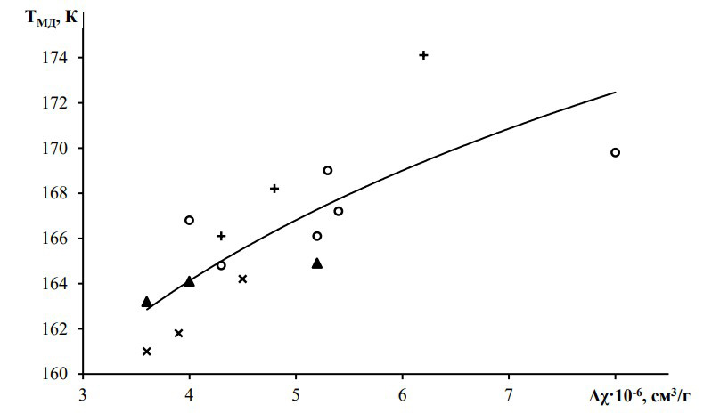 Рисунок 2 – Зависимость температуры фазового перехода от изменения магнитной восприимчивости Δχ для соединений V2±δ O3 (o), V2-δ Al0,02 O3 (+), V2-δFe0,02O3 (x), V2-δ Cr0,02O3 (▲)