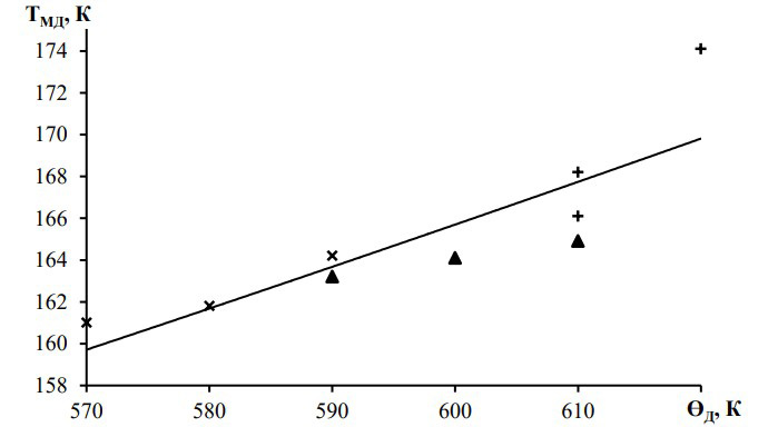 Рисунок 3 – Зависимость температуры фазового перехода от температуры Дебая (QД) для соединений V2±δ O3 (o), V2-δ Al0,02 O3 (+), V2-δ Fe0,02O3 (x), V2-δ Cr0,02O3 (▲)