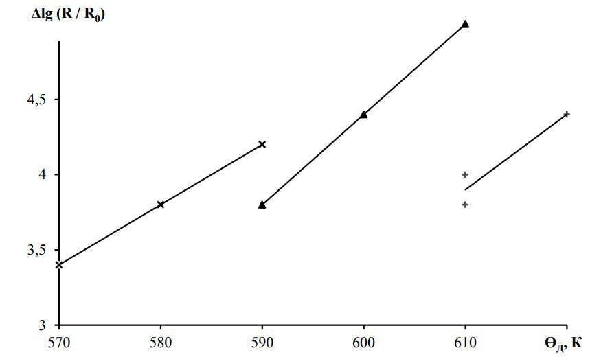 Для всех серий растворов V2-δMe0,02O3 с ростом температуры Дебая характерно увеличение скачка электросопротивления ∆lg(R/R0) (рис. 5). Полученные экспериментальные результаты не позволяют сделать более детальное количественное описание закономерности, но можно говорить об использовании модели Пайерлса для описания ФПМД и в легированных системах трехокиси.