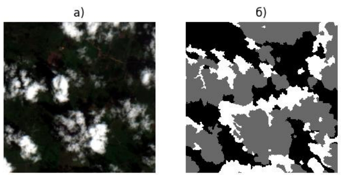 В нашем исследовании мы используем набор данных CloudSEN12 [3]. В нем собраны фрагменты снимков размером 509 на 509 пикселей, произведенных спутником Sentinel-2 [5], с размеченными облаками и их тенями. Для большей наглядности представим размеченный фрагмент с идентификатором «20181219T133221_20181219T133216_T23MMR» (рисунок 1). Здесь отображен непосредственно сам снимок (а) и разметка (б) – облака обозначены серым цветом, тени – белым.