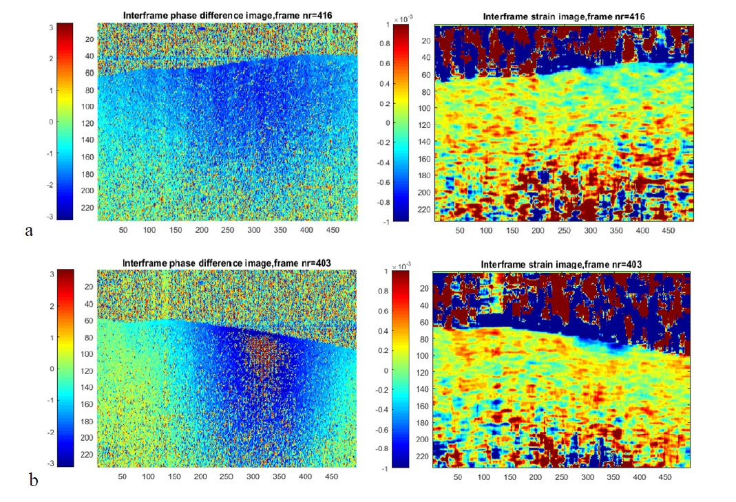 Рисунок 5. Деформационная картина при лазерном импульсе для: а – интактной ткани, b –после лазерного воздействия и пропитки наночастицами.