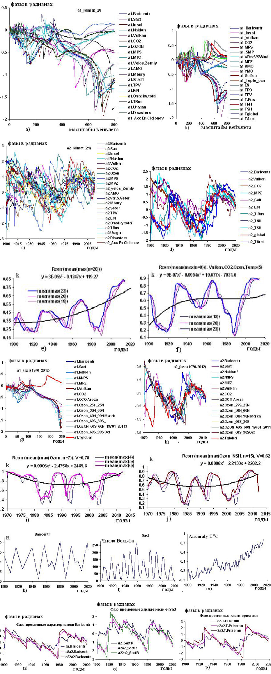Рисунок 1. Графики изменений вейвлетных: a), b) фазо-частотных и с), d) фазо-временных характеристик групп гелиокосмических и климатических переменных; e) и f) изменений коэффициентов корреляций k (согласованностей) вейвлетных фазо-временных характеристик групп гелиокосмических и климатических 28-и и 8-и переменных, соответственно: Baricentr, Vulkan, , MPZ, Golfstrim, температур в Арктике (T.Arct), России (T.Rus), северном (TNH) и южном (TSH) полушариях, на планете (T.global)) в интервалах времени 1900–2020 годы по наблюдениям 18, 20, 23 лет в скользящем режиме с параметрами (n1,n2), где n1-число переменных, n2 – число дискретнов в скользящем окне наблюдений; g) и h) фазо-частотных и фазо-временных характеристик: Baricentr, Sact, Naklon, NMPS, MPZ, Vulkan, , Tglobal и концентраций озонового слоя по наблюдениям над Арозой (OCO Aroza) и на широтах северного и южного полушарий по наблюдениям в 1970-2012 годы: global (60⁰S-60⁰N), NH (30⁰N-60⁰N), tropics (25⁰S-25⁰N), SH (60⁰-30⁰S), NH march (60⁰N-90⁰N), SH October (60⁰S-90⁰S); i) и j) согласованности изменений k озонового слоя в атмосфере над Арозой и на полушариях Земли на разных широтах (n=7 переменных) и согласованности изменений гелиокосмических переменных (Baricentr, Sact, Naklon, NMPS, MPZ, Vulkan, ) озонового слоя в атмосфере в полушариях NH и SH Земли и глобальной температуры (n=15) по наблюдениям за переменными в 1970–2012 годы (графики получены коррелированием фазо-временных характеристик переменных в скользящем режиме по наблюдениям 4, 5 и 6 лет); k), l), m) и n), o), p) – графики изменений переменных Baricentr, Sact, Tprizemn (global) и их вейвлетных фазо-временных характеристик , , полученных по наблюдениям в 1900–2020 годы.