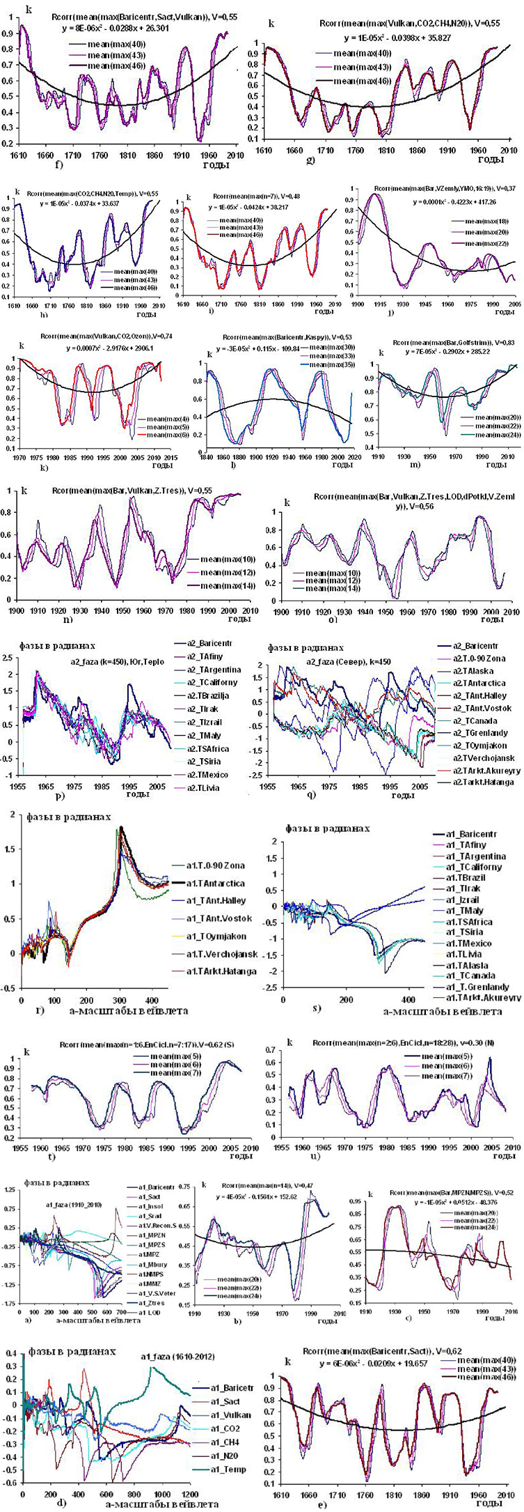 Рисунок 2. Графики вейвлетных фазо-частотных характеристик (ВФЧХ) гелиокосмических и климатических переменных и согласованностей k указанных на графиках групп переменных в фазо-временной области в интервалах наблюдений: а) ВФЧХ движений Солнца и переменных, характеризующих активность Солнца и Земли (Baricentr, Sact, Insol, Srad, V.reconstr.veter, MPZN, MPZS, MPZ, M.bury, NMPS, MMZ, V.S.veter, Z.Tres, LOD), b) изменений коэффициента k n=14 переменных, перечисленных выше, с) изменений коэффициента k Baricentr и скоростей дрейфа магнитных полюсов Земли MPZN и MPZS; d) ВФЧХ переменных (Baricentr. Sact, Vulkan, , , , Tglobal) по наблюдениям в 1610–2012 годы [20, 23, 51, 52, 53]; изменений коэффициента k: e) Baricentr, Sact, f) Baricentr, Sact и Vulkan, g) парниковых газов , , , влиянием вулканических извержений Vulkan, h) Tglobal влияниями , , (парниковый эффект); i) всех n=7 переменных, перечисленных в d влиянием переменной Baricentr; j) скорости вращения Земли V.Zemly, YMO, осадков на Земле (Osadky), льдов а Арктике (Led.Srct), наступающих льдов в полушариях (Lednicy,nast.NSH) Земли, морских льдов (Led.More) влиянием переменной Baricentr в интервале наблюдений 1900–2005 годы; k) Baricentr, концентрации озонового слоя в атмосфере в полушариях Земли (n=7), по наблюдениям в 1970–2010 годы; l) Baricentr, изменения уровня Каспийского моря по наблюдениям в 1840–2018 годы; m) Baricentr, изменения интенсивности течения Гольфстрим; n) Baricentr, Vulkan, землетрясения Z.Tres; o) Baricentr, Vulkan, Z.Tres, LOD, dPOtkl по наблюдениям в 1910–2010 годы; p), q) вейвлетные фазо-временные и r), s) фазо-частотные характеристики изменений температуры воздуха в странах и территориях, расположенных на теплых и холодных районах Земли по наблюдениям в 1957–2010 годы: в Антарктиде, в пунктах Халли и Восток [54], Оймяконе [55] и Верхоянске [56], Якутии [57], в Арктических Хатанге [58] и Акюрейри [59], Афинах, Аргентине, Калифорнии, Бразилии, Ираке, Израиле, Мали, южной Африке, Сирии, Мехико, Ливии, Аляске, Канаде, Гренландии [60], а также изменений переменной Baricentr; t), u) изменений коэффициента согласованности k переменных: Baricentr, аккумулированной энергии циклонов (асс.En.Ciclon), магнитных полей Солнца и Земли (NMPS, MMZ, MPZ, Mbury, реконструированной скорости солнечного ветра (RSW) с изменениями приземных температур в южных и северных территориях Земли, приведенных на графиках p и q рисунка 2 соответственно.