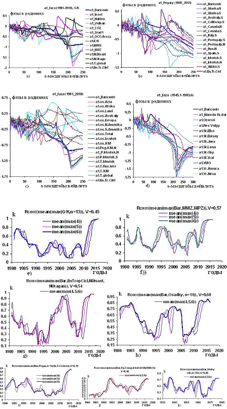 Рисунок 3. Графики изменений вейвлетных фазо-частотных характеристик гелиокосмических, климатических переменных, наблюдений осадков, пожаров, природных катастроф, наводнений, стоков и уровней крупных рек и согласованность их изменений с изменениями Baricentr и других переменных в фазо-временной области: а) Baricentr, Insol, Naklon,Vulkan, , Srad1, OCO Aroza, явление Эль_Ниньо (E/N), магнитный момент Земли (MMZ [26]), магнитное поле Земли (MPZ) [49], число природных катастроф (N.Disaster) [68] и ураганов (N.Uragan [69], T.global, аккумулированная энергия тропических циклонов (En.Tr.Ciklon [70]) по наблюдениям в 1981–2018 гг.; b) Baricentr, количество (N) и площади (S) пожаров в частях света: Alaska.N, Alaska.S, Avstraly.S, Californy.S, Canada.S, Canada.N, Maly.S, Portugaly.S, Portugaly.N, Rus.N, Spain.S, Irkutsr.S, Irkutsk.N [71], ХМАО (X/M).S, En.Tr.Ciklon по наблюдения в 1985–2015 гг.; c) Baricentr, осадки, температуры в странах света: Azia Africa, Land, Avstraly, Evropa, N.America, S.America, Total, T.Irkutsk [72], X/M [73, 74], T.global, En.Tr.Ciklon по наблюдениям в 1981–2018 гг.; d) Baricentr, стоки (St) и уровни (Yr) морей, рек и озер, наводнений: наводнение в Краснодарском крае (Navodn Kr_dar) (побережье Черного моря), Kaspy [75], ресурс Волги (Res.Volgy [76]), St.Elba, St.Enisey, St.Jana, St.Lena, St.Oby, St.Ural, YMO, Yr.Amur [77], Yr.Neva, St.Neva [78] по наблюдениям в 1945–2014 гг.; графики коэффициентов k корреляций между переменными в фазо-временной области в 4, 5 и 6 лет в скользящем режиме в интервале времени 1981–2018 гг., e) переменных, приведенных на графиках рисунка 3 а; f) переменных Baricentr, MMZ, MMP приведенных на графиках а рисунка 3; g) переменных Baricentr, аккумулированной энергии тропических циклонов (En.Trop.Ciclon), числа природных катастроф (Disastes) и ураганов (Uragan), приведенных на графиках а рисунка 3; h) переменных Baricentr, Osadky n = 11, приведенных на графиках с рисунка 3; i) переменных Baricentr, лесных пожаров (количества и по площади охвата (Pogary)), n = 14 в странах света, приведенных на графиках b рисунка 3; j) переменных Baricentr, пожаров и температур в Иркутской области и ХМАО (Pg.Irkutsk, Temp); k) переменных Baricentr, стоков рек, уровней водоемов (Stoky rek, Uroven), приведенных на графиках d рисунка 3.