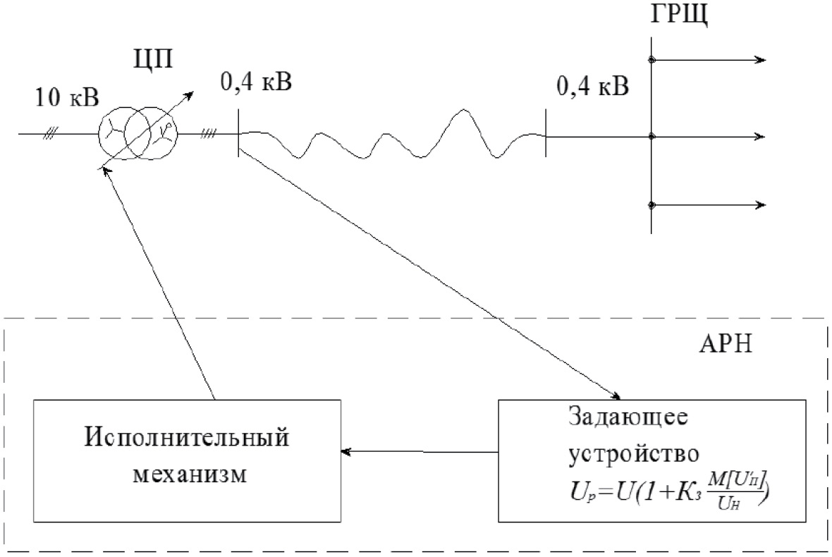 Для повышения устойчивости узлов нагрузки по напряжению рекомендуется использовать также систему автоматического регулирования напряжения (АРН). Предложено стабилизировать напряжение в центре питания (ЦП) электропередачи «берег – судно» 0,4 кВ. При этом основным достоверным параметром, характеризующим уровень напряжения, представляется математическое ожидание кондуктивной ЭМП по отклонению напряжения M[δUП], которая имеет знак минус. На рисунке 3 показана блок-схема АРН [26–28].