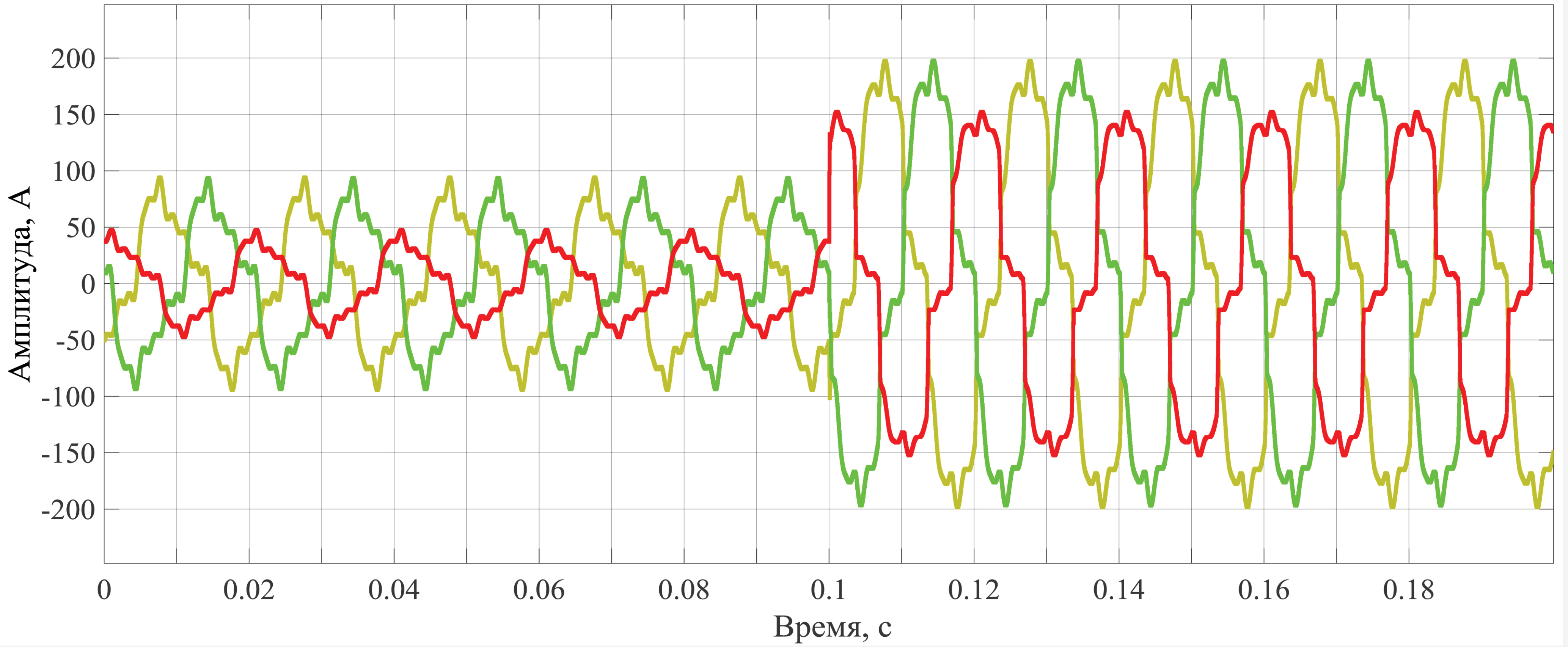 В результате имитационного моделирования был получен несинусоидальный нестационарный режим с осциллограммами токов, представленными на рисунке 2.