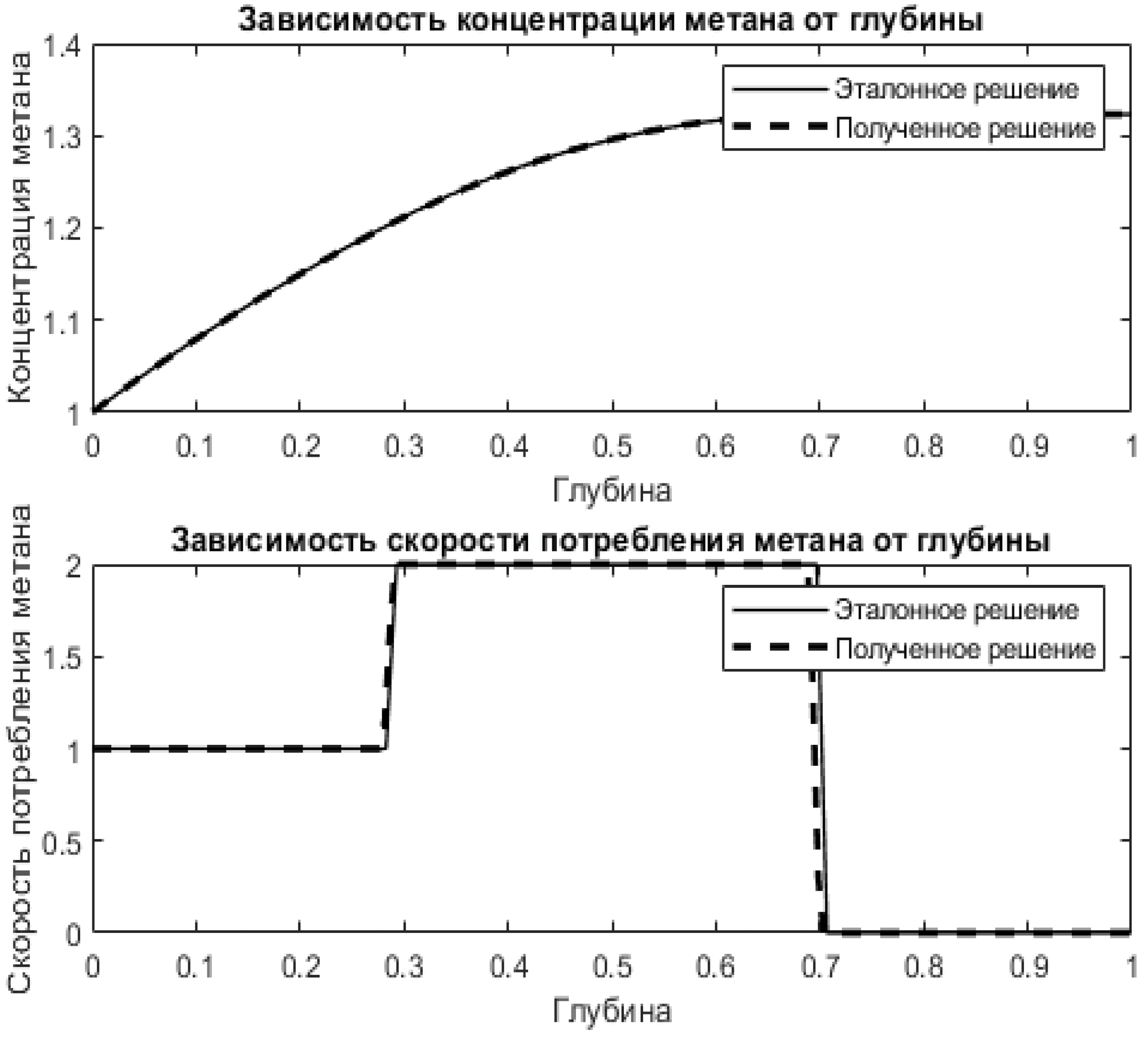В результате расчётов было восстановлено исходное значение функции в точках потребления метана по глубине на основе распределения концентрации метана по глубине. В качестве входных данных были взяты значения функции в точках замеров. Значения одномерного массива метана были получены в ходе решения прямой задачи согласно системе (3), где входным вектором скорости потребления метана выступал некоторый экспериментальный одномерный массив данных [3], представленный на рисунке 1.