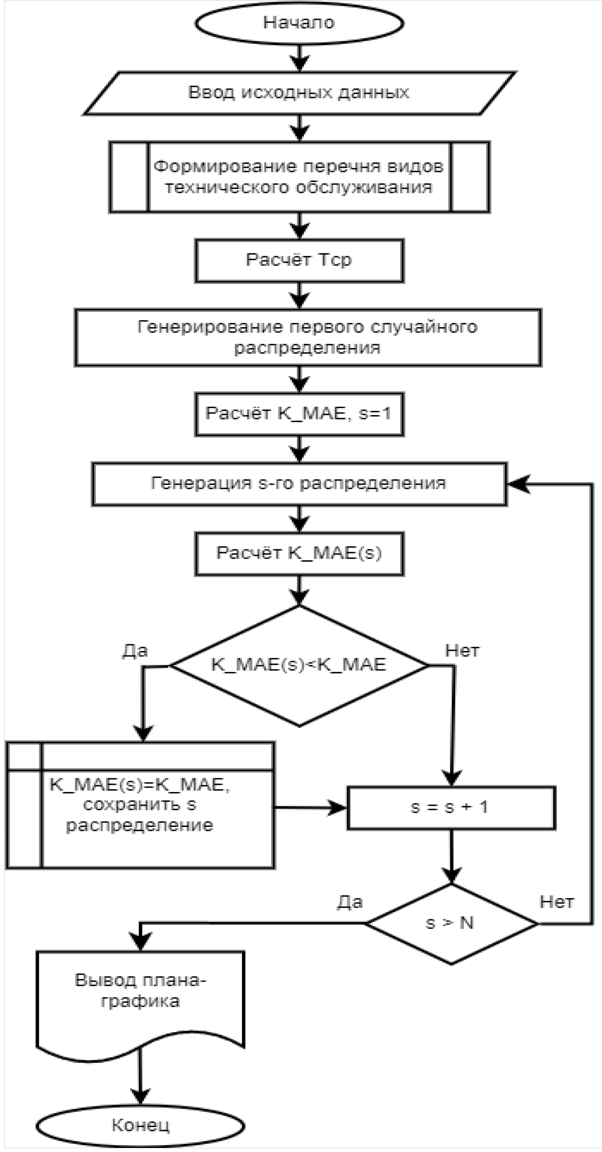 Алгоритм обеспечения равномерного распределения видов ТО для ССиА на основе полного перебора проводится в соответствии с блок-схемой, представленной на рисунке 1.