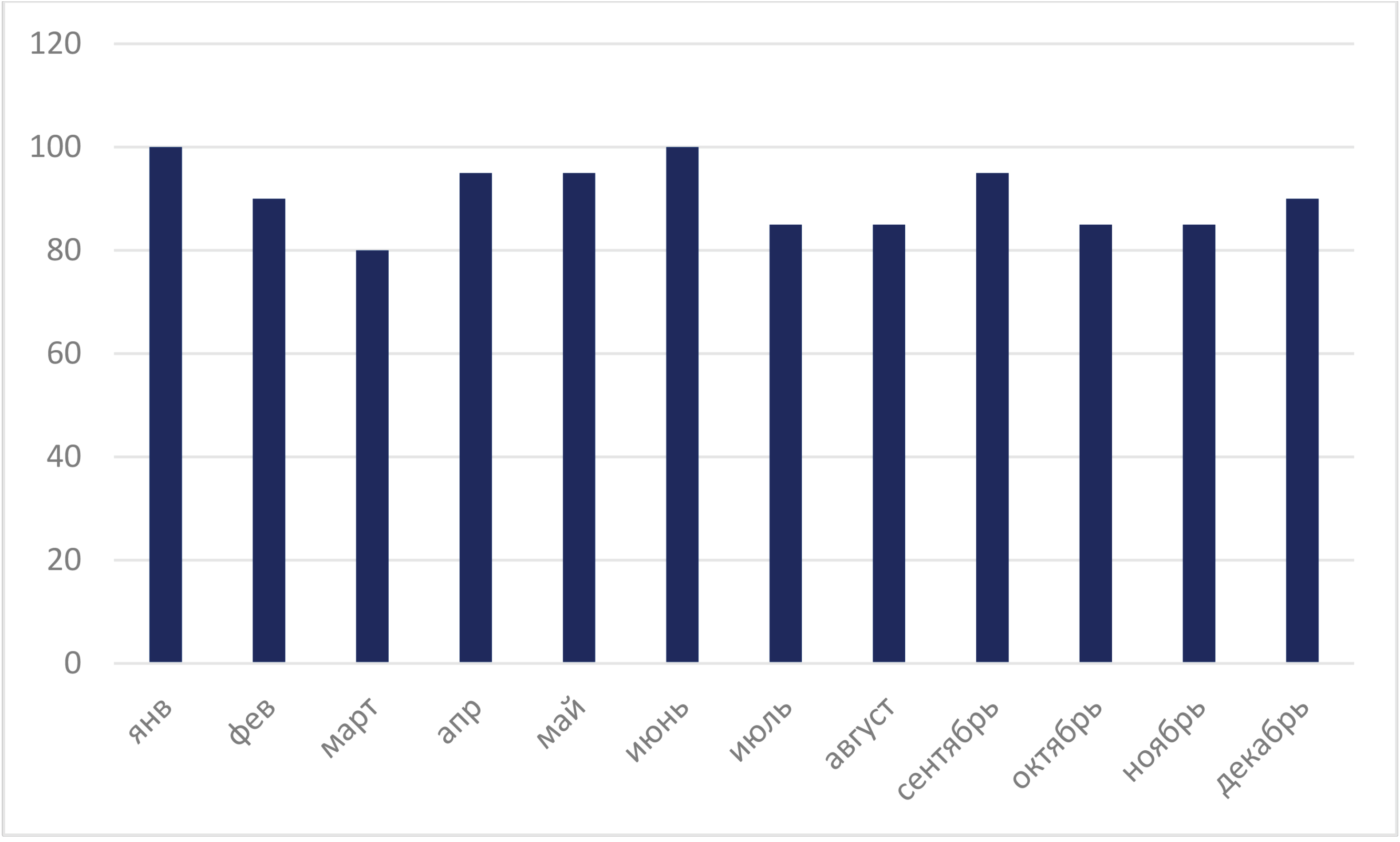В ходе работы алгоритма на ПЭВМ (процессор Intel Core i3-3240 CPU 3.40GHz, оперативная память 4 ГБ, ОС Windows 10 Pro 22H2) рассчитанное значение критерия составило KMAE ≈ 5,49 мин. Графическое представление затрат времени на осуществление технического обслуживания по месяцам для наилучшего значения целевой функции отображено на рис. 4.
