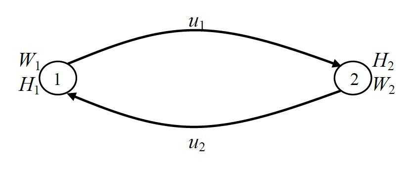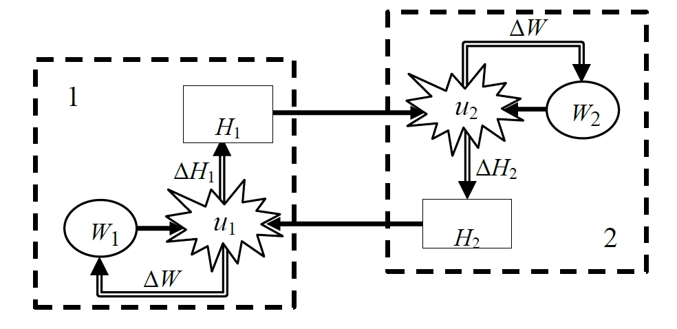 Штриховыми рамками на рис. 2 выделены субъекты (участники конфликта). Звездой показаны сами конфликты (рассогласования); двойными стрелками показаны усилия, направленные на изменение параметров конфликта. Здесь и – управляющие усилия, прилагаемые субъектом , и направленные на изменение его собственных параметров и .