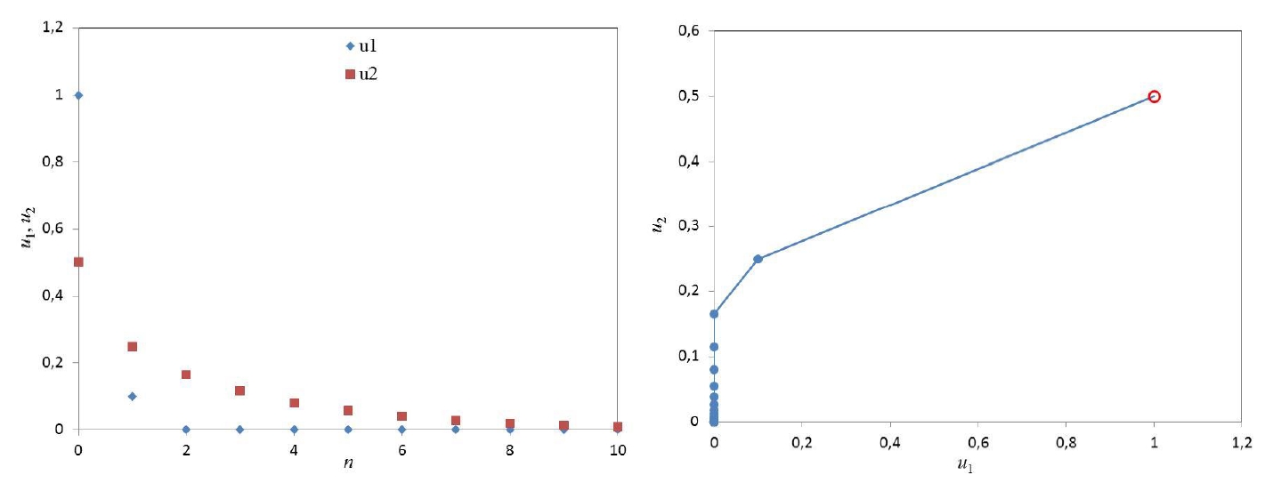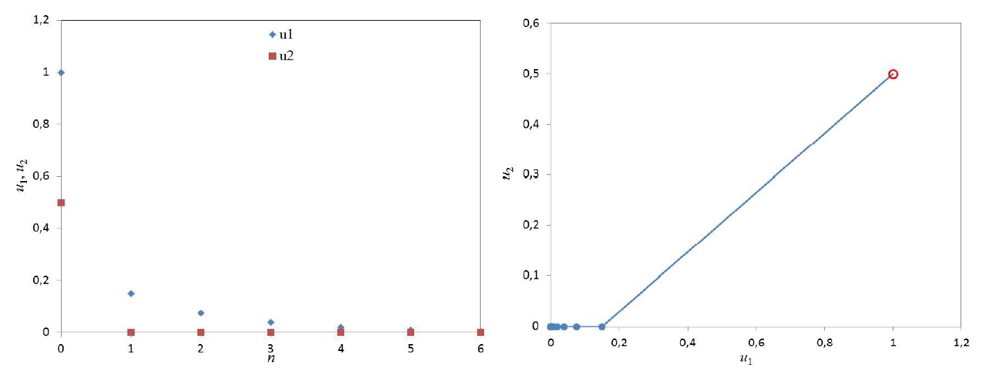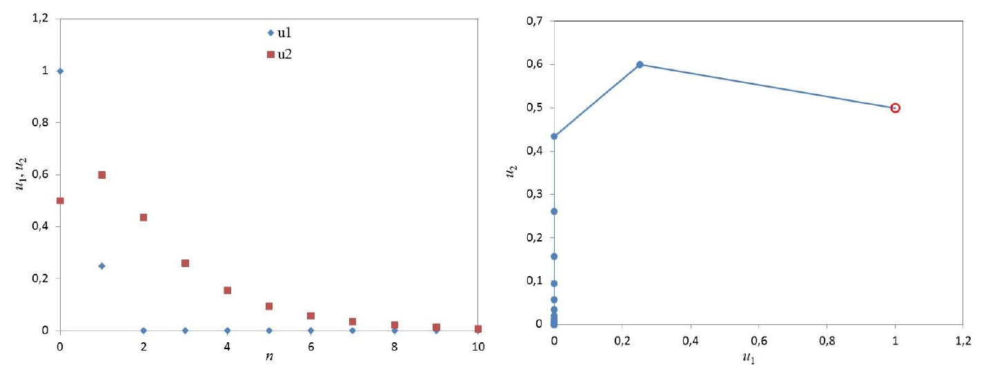 Рисунок 4 – Зависимости и (слева) и фазовая траектория конфликта работник-работодатель (справа) для и (0.5; 0.4)