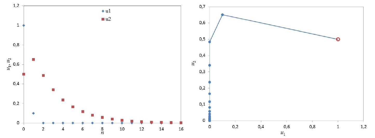 Рисунок 3 – Зависимости и (слева) и фазовая траектория конфликта работник-работодатель (справа) для и ( 0.737; 0.163)
