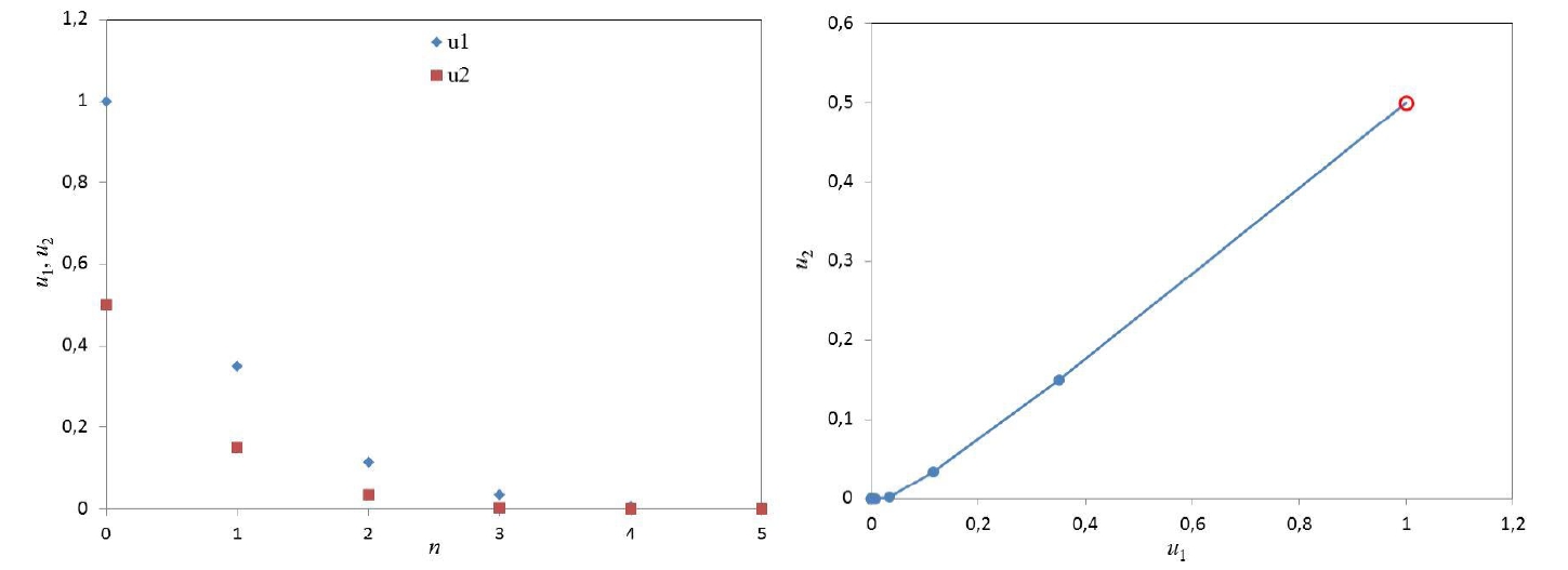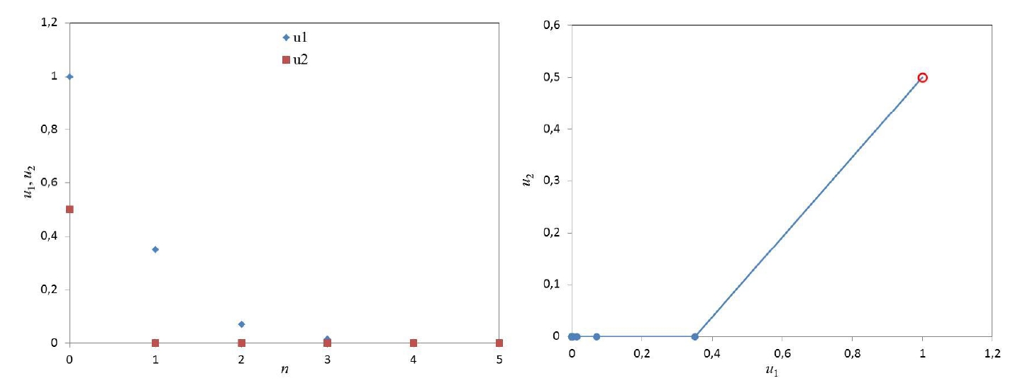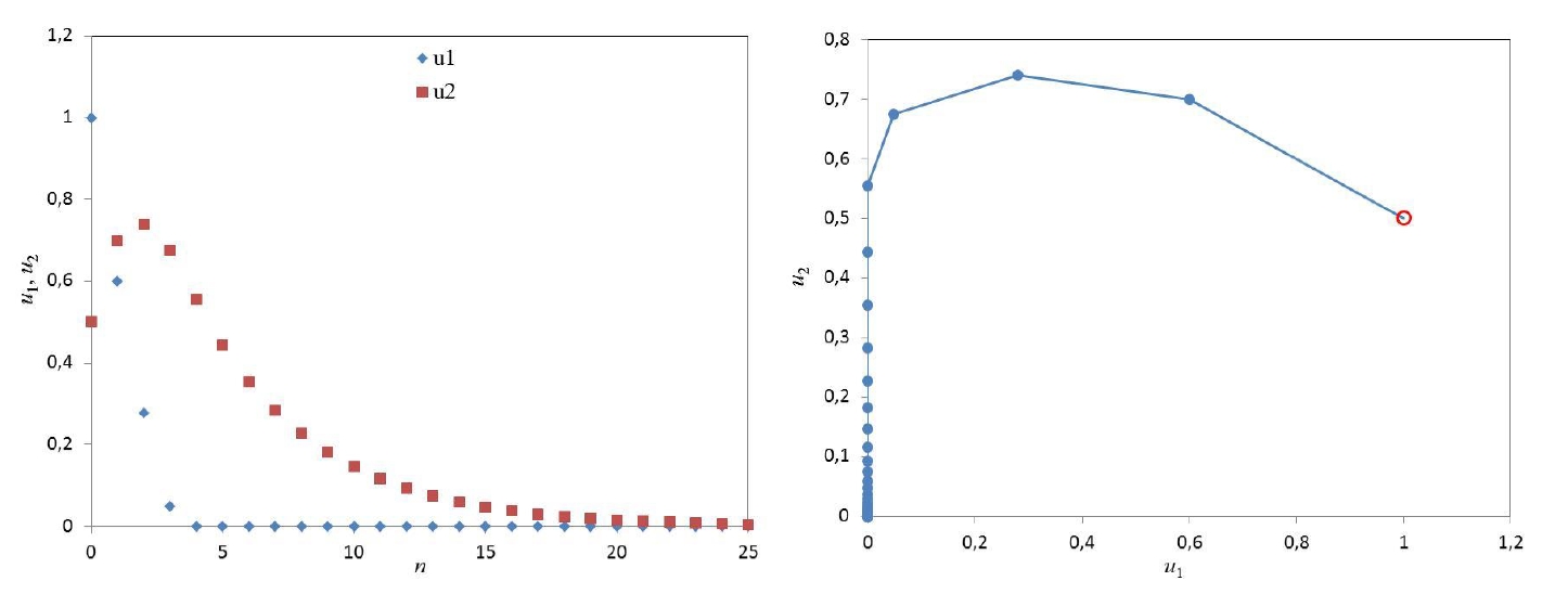 Рисунок 5 – Зависимости и (слева) и фазовая траектория конфликта работник-работодатель (справа) для и (0.5; 0.4)