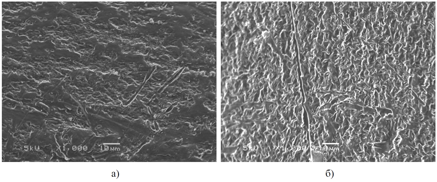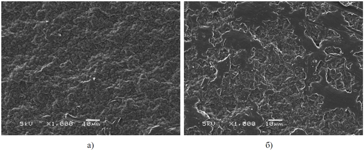 На рисунке 11 приведены изображения структуры материала в ЗТВ со стороны отвода сварных соединений. К сожалению, наличие пленки, образовавшейся в процессе травления образца, затрудняет проведение полного анализа структуры, сформировавшейся в процессе сварки (рисунок 11, а). Тем не менее, можно сделать вывод, что сформировалась сферолитная структура с размерами образований от 2 до 5 мкм. С удалением от сварного шва в зоне термического влияния седлового отвода в результате недостаточного плавления при нагреве и быстрого охлаждения формируется надмолекулярная структура материала не сферолитная, а фибриллярная с хаотичным расположением фибрилл (рисунок 11, б).