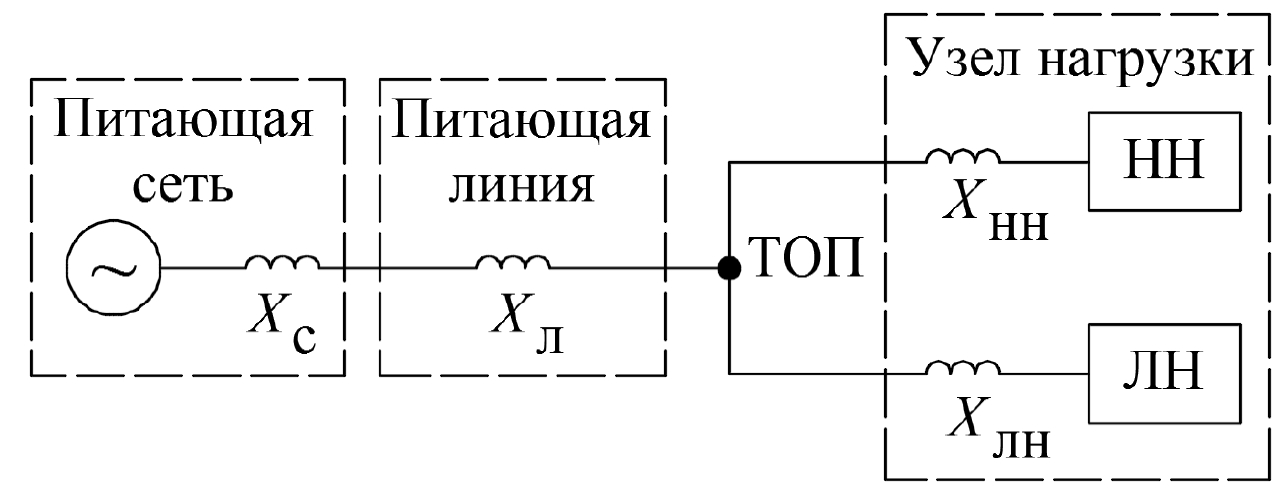 - питающая линия от источника до узла нагрузки представлена в виде индуктивного сопротивления Xл;