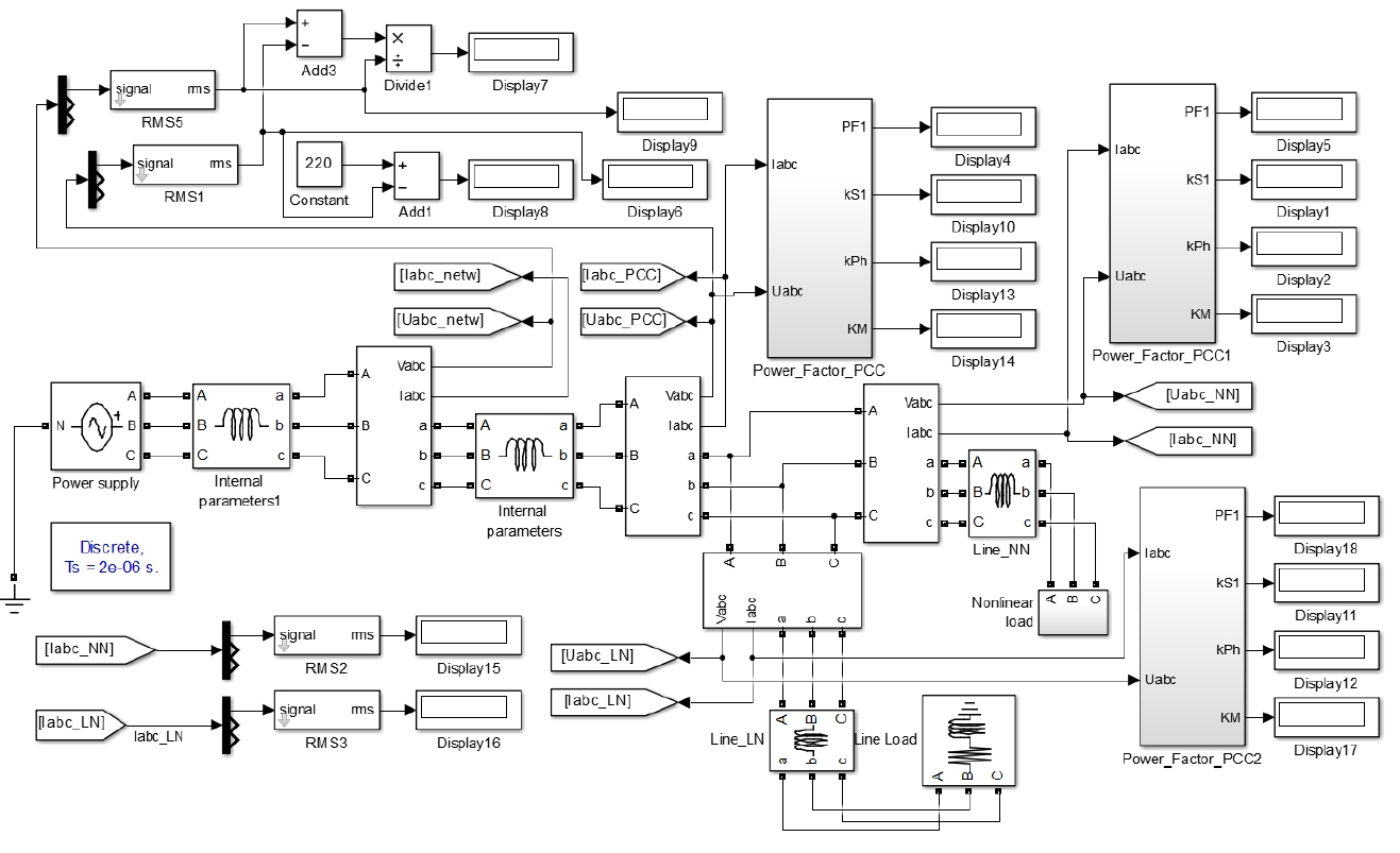 Основные результаты исследования: разработана компьютерная имитационная модель промышленной системы электроснабжения с линейной и нелинейной нагрузками, а также с наличием гармонических искажений со стороны питающей сети. Получены зависимости составляющих коэффициента мощности при несинусоидальных режимах от вариации сопротивления энергосистемы и длины питающей линии, соединяющей источник и узел нагрузки.