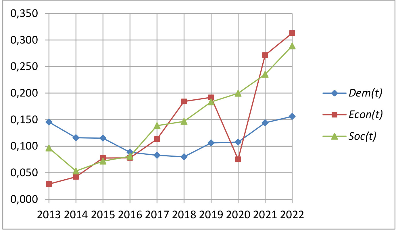 Рисунок 1. Динамика значений укрупненных показателей Dem(t), Econ(t) и Soc(t) системы урбанизации региона ХМАО-Югра в период с 2013 по 2022 г.