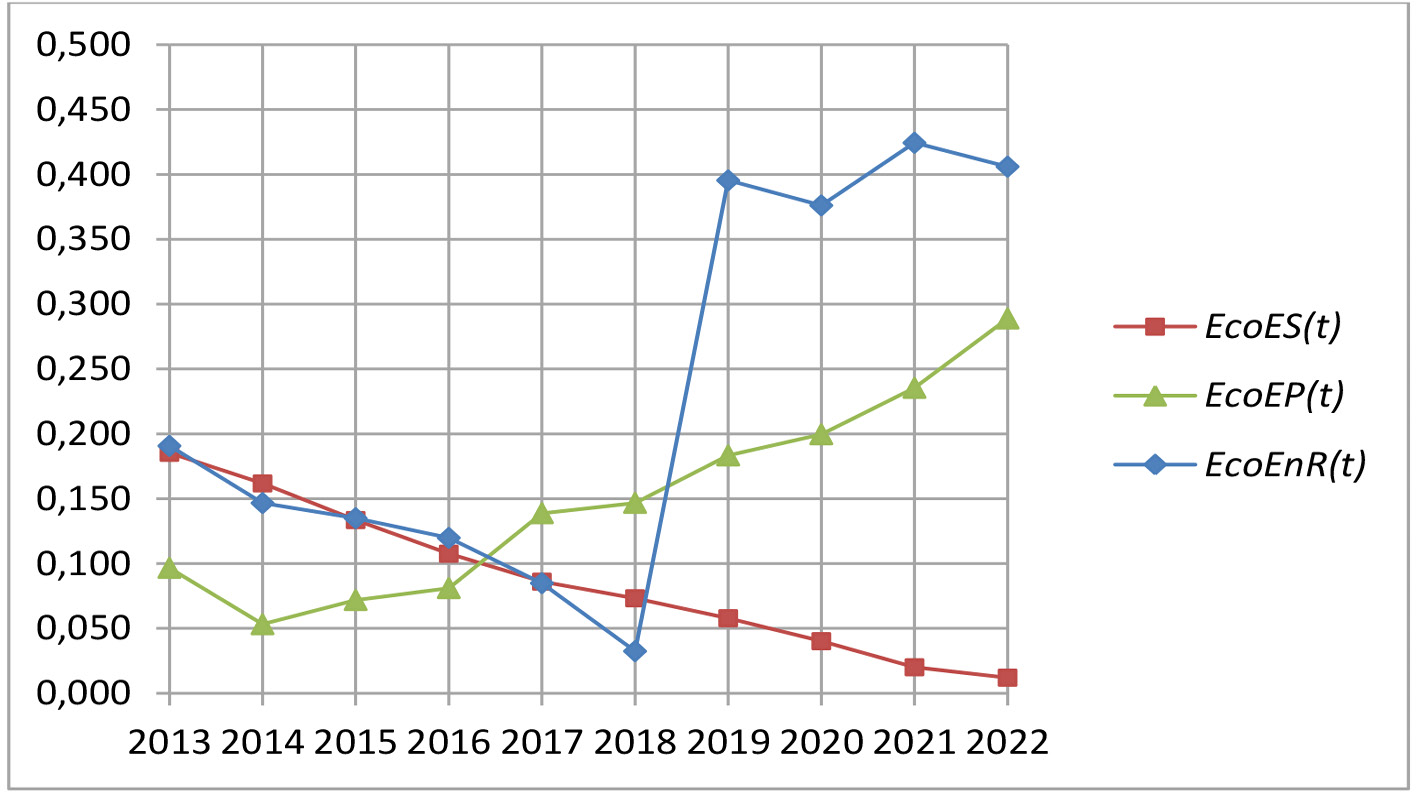Рисунок 2. Динамика значений укрупненных показателей EcoES(t) EcoEP(t) и EcoEnR(t) экологической системы ХМАО-Югры в период с 2013 по 2022 г.