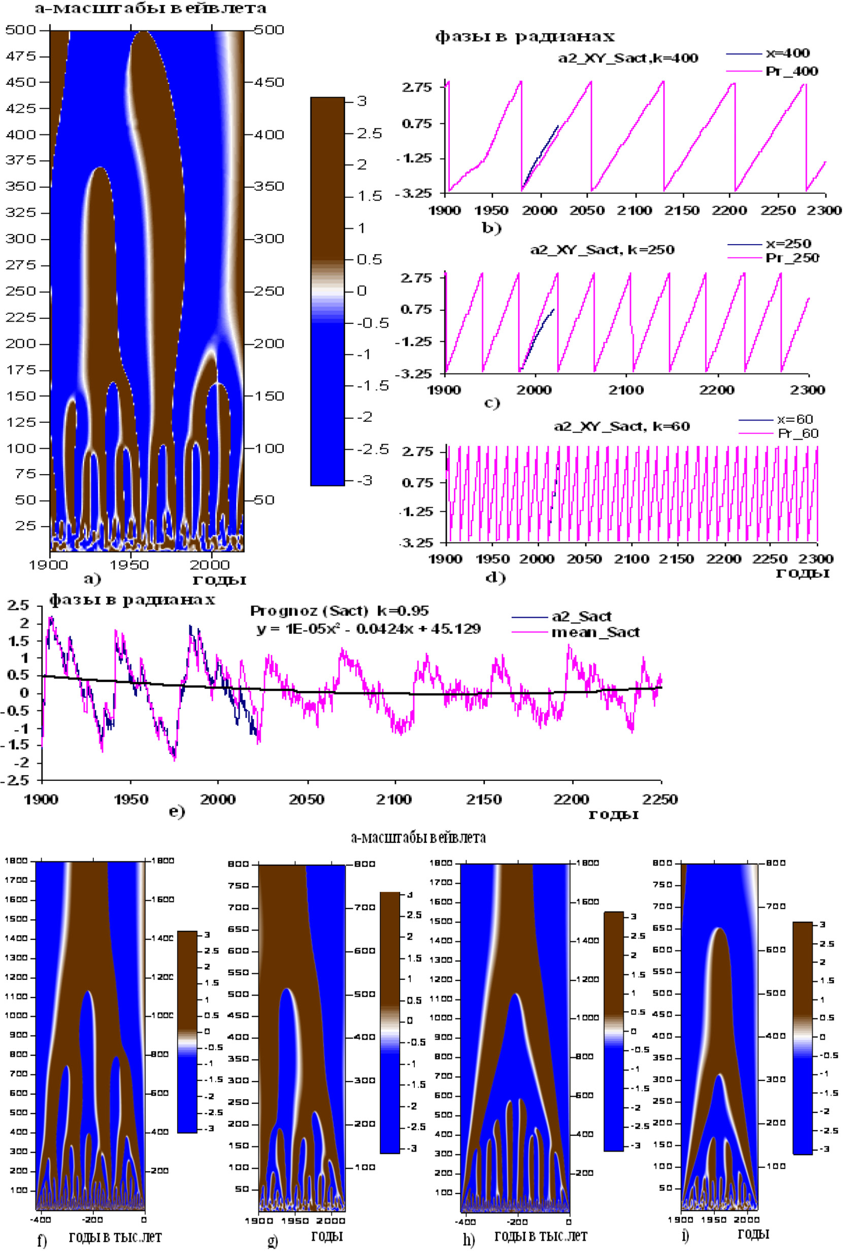 Рисунок 1. а) изображение временной вейвлетной фазо-частотной функции φf (a,b) солнечной активности f(t)=Sact(t) [5], полученной при k=500 на временном интервале 1900–2020 гг.; b) – d) графики изменений фаз функции φf (a,b), полученные на ее разрезах (темные линии) при k=400,..250,..60 и их прогнозированных значений (красные линии), изменяющихся в интервале ±π по ординате в 2020–2300 гг.; e) графики реальных (темная линия, a2_Sact) и прогнозированных (красная линия, mean_Sact) вейвлетных фазо-временных характеристик изменений солнечной активности в интервале времени 1900–2300 гг., согласованные в наблюдаемом интервале времени 1900–2020 гг. с k = 0,95 с изменениями реальной временной фазовой характеристики. Прогнозированная кривая получена усреднением прогнозированных фазо-временных характеристик, полученных при значениях масштаба a вейвлета (‘cgau5’) k = 475, 460, 450, 425, 400, 360, 345, 325, 300, 275, 250, 225, 200, 175, 150, 140, 120, 100. 80, 60, 40, 22, 12 на изображении а; изображения вейвлетных фазо-временных характеристик: f), h) CO2 – в атмосфере [6, 7] и угла наклона Земли (Naklon) [8] по наблюдениям в 422 – 0 тыс. лет в прошлом; g), i) – глобальной температуры (T.global) [9] и северо-атлантических колебаний (AMO) по наблюдениям в 1900–2020 гг. [10]