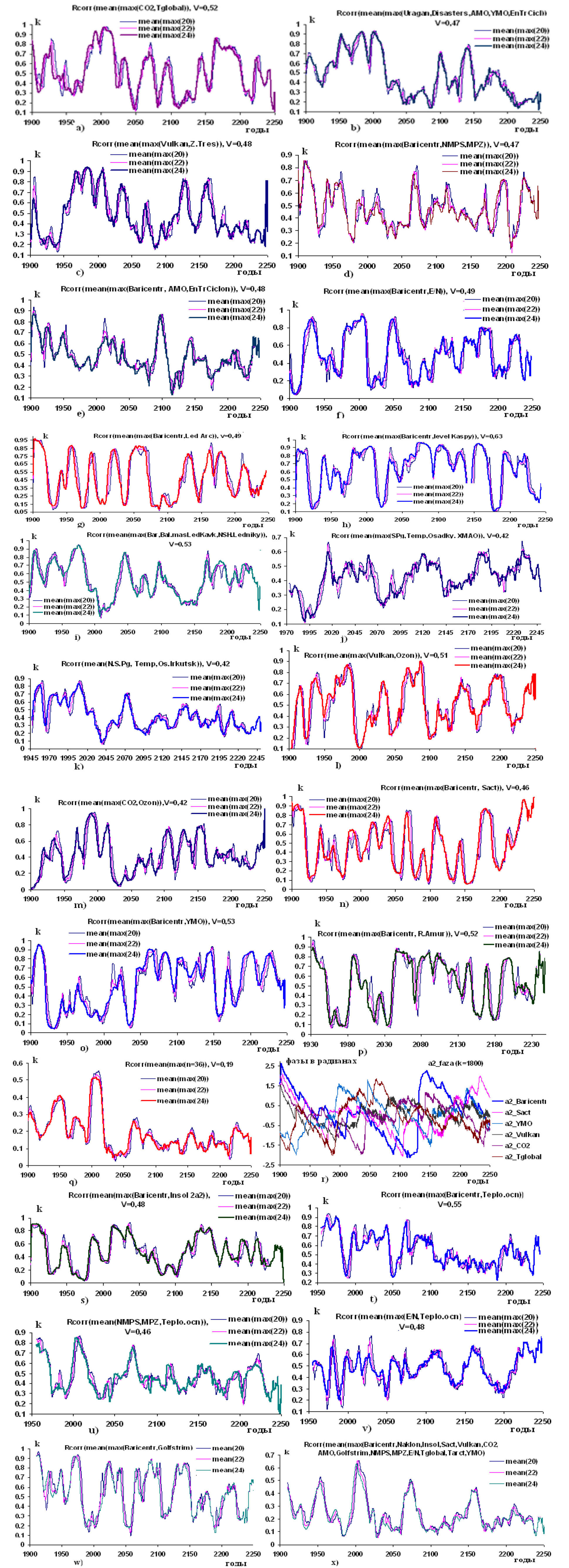 Рисунок 3. Графики согласованностей изменений групп взаимодействующих климатических переменных Земли в вейвлетной фазо-временной области в интервале 1900–2250 гг.: а) T.global и CO2 парникового эффекта; b) количества ураганов, природных катастроф, северо-атлантических осцилляций (AMO), уровня Мирового океана (YMO) и аккумулируемой энергии тропических циклонов (AccTropEnCiclon); c) количества вулканов (Vulkan) и землетрясений (Z.Tres); d) барицентрических движений Солнца (Baricentr), напряженности магнитного поля Солнца и магнитного поля Земли; e) переменных Baricentr, AMO, AccTropEnCiclon; f) Baricentr и явления Эль-Ниньо (E/N); g) Baricentr и льдов в Арктике (LedArct); h) Baricentr и уровня Каспийского моря (Kaspy); i) Baricentr, балансовой массы льдов Кавказа (BalansMassaLedKavkaz) и наступающих льдов в Северном и Южном полушариях Земли (NSH.LedNastup); j) площадей лесных пожаров, осадков и температуры в ХМАО (SPg.TempOsXMAO) в 1973–2250 гг.; k) количества и площадей пожаров, температуры и осадков в Иркутской области (NSPgTempOs.Irkutsk) в 1947–2250 гг.; l) количества вулканов в мире и концентрации озона в атмосфере (Vulkan, Ozon); m) CO2 и Ozon; n) Baricentr и Sact; o) Baricentr и YMO; p) Baricentr и уровня реки Амур (R.Amur) в 1932– 2250 гг.; q) согласованностей n =36 прогнозированных переменных в интервале 1900– 2250 гг.; r) графики согласованных пошаговых изменений переменных: Baricentr, Sact, YMO, Vulkan, CO2, Tglobal в наблюдаемом и прогнозированном интервале времени 1900–2250 гг. в фазовой области; согласованностей изменений групп: s) Baricentr и Insol в интервале 1900–2250 гг.;t) Baricentr и теплосодержание океана (Teplo.ocn) до глубины 700 м; u) YMO, TPV, TPO, TPO.Tropic (температура поверхности океана в тропической зоне), Teplo.ocn; v) E/N,Teplo.ocn в интервале 1955–2250 гг.; w) Baricentr, Golfstrim; x) Baricentr, Naklon, Insol, Sact, Vulkan, CO2, AMO, YMO, Golfstrim, NMPS, MPZ, E/N, Tglobal, Tаrctic, YMO