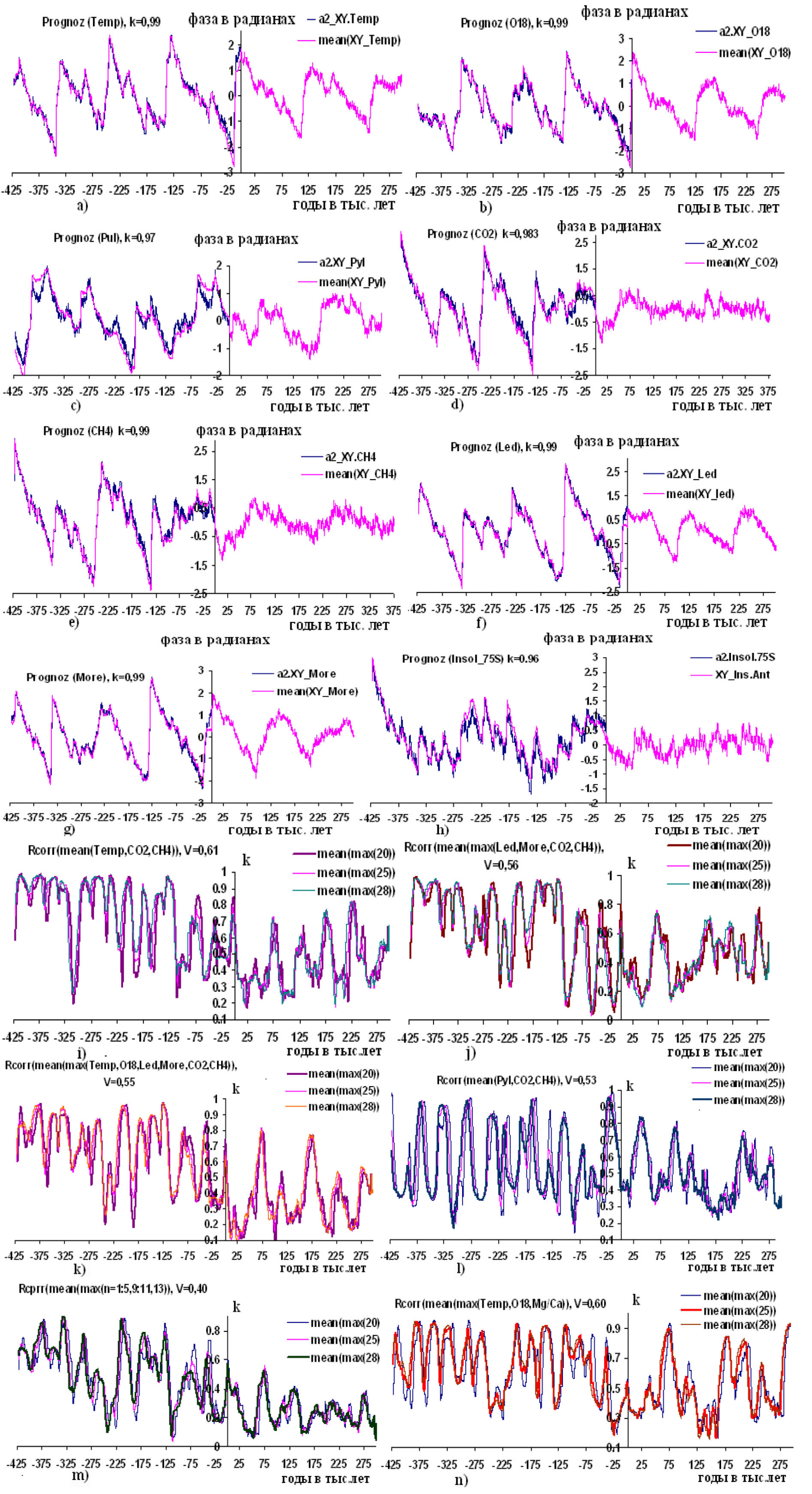 На графиках i, j, k, m, n рисунка 4 в современности, в окрестности нулевой точки во времени, в период глобального потепления наблюдаются пики согласованных изменений групп переменных с V~0,9: парниковых газов и температуры, изменений Led, More и парниковых газов: (CO2, CH4, Temp), (Led, More, CO2, CH4) (Temp, Led, More, CO2, CH4) Характерно то, что пики роста кривых в современности наблюдаются при взаимодействии мощности льдов в Антарктике (Led), уровня Мирового океана (More) и приземной температуры (Temp) с изменениями парниковых газов CO2, CH4). Нисходящие склоны пиков согласованных изменений групп переменных достигают минимумов, оледенений, в ~11÷13-тысячные годы в будущем с последующими циклическими изменениями с периодами ~40, 48, 55, 60 тыс. лет. На графиках прогнозированных переменных рисунка 4, в современности глобального потепления, в нулевой точке, в фазе роста находятся изменения переменных: Prec, Ekc, Temp, δ18O, More, Led. Интервалы прошлых оледенений в ~20 тыс. годы наблюдаются на графиках i÷n рисунка 4. На этих же графиках наблюдаются интервалы предполагаемых оледенений в прошлом при малых значениях k и потеплений при высоких значениях k.