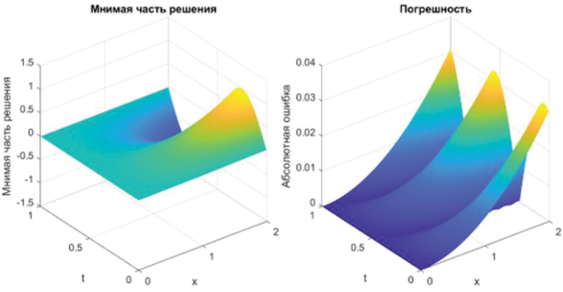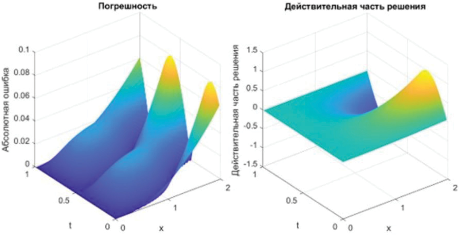 Иллюстрация численного эксперимента представлена на рисунках 1 и 2 для соответствующих действительной и мнимой частей решения. Погрешность и порядок сходимости метода, в зависимости от пространственного шага h, представлены в таблице, где , – максимальная погрешность.