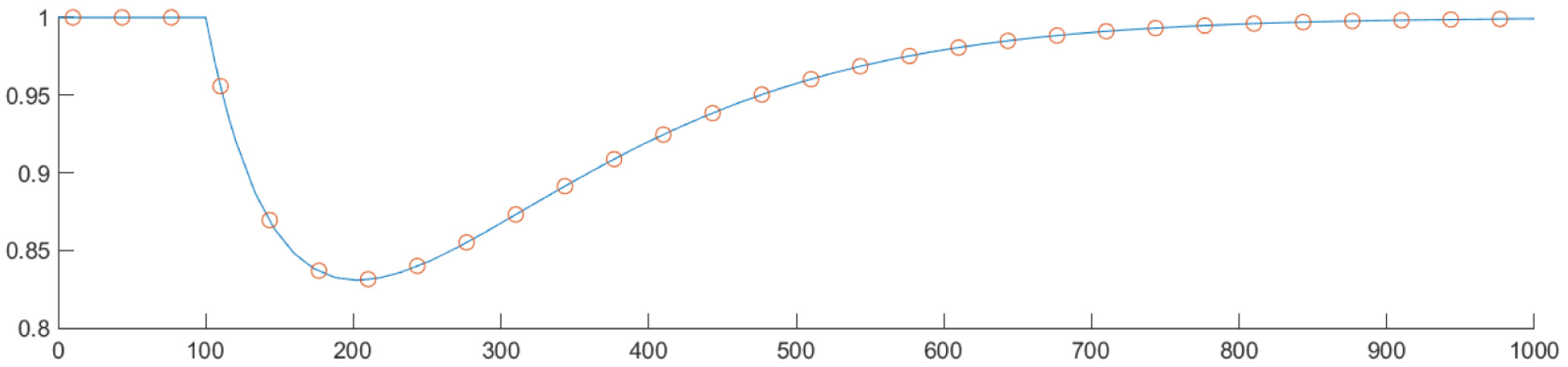 В описанном ниже числовом эксперименте значения уровня кислорода V в точках P, использованные как «результаты измерений», соответствуют параметрам x0 = 100, q = 0,5, k = 0,01, a = 0,01, Y = 1.