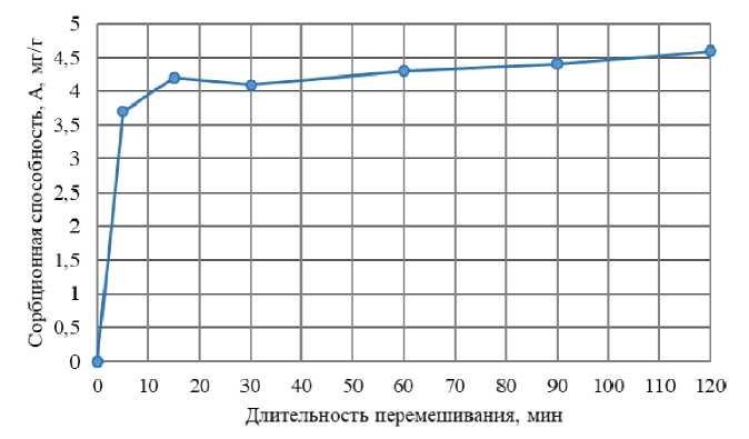 Далее изучали кинетику процесса – длительность перемешивания изменяли от 5 до 120 мин (рис. 3). Кинетические кривые сорбции показали, что сорбционное равновесие устанавливается уже через 15 мин контакта адсорбента и молекул фенола.