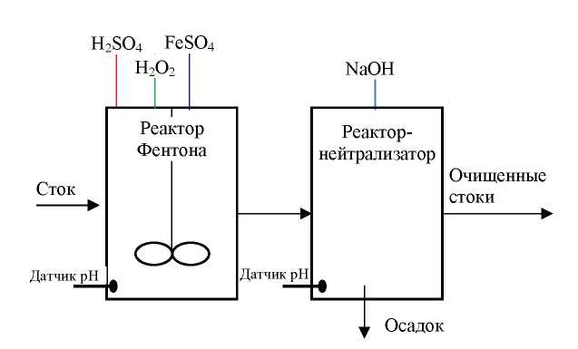 Затем обработанные сточные воды поступают в реактор-нейтрализатор, в который подается гидроксид натрия для доведения pH среды до значения, позволяющего сбрасывать стоки на биологические очистные сооружения. На данной стадии происходит выпадение в осадок гидроксида трехвалентного железа. Так как трехвалентное железо является коагулянтом, при этом происходит дополнительная очистка воды от взвешенных и окрашенных примесей. Очищенные сточные воды далее поступают на общезаводские очистные сооружения.