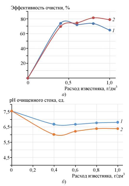 Рис. 3. Влияние расхода известняка в качестве регулятора кислотности на эффективность очистки стоков по мутности (а) и величину рН среды (б)