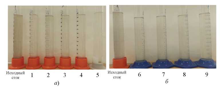 Очистка сточных вод проводили на реальных стоках очистных сооружений (ОС) ГУП «Водоканал» (Белгород, Россия), отобранных на стадии механической очистки – после решеток с исходными показателями: мутность 194 NTU и рН 7,06. Эффективность очистки оценивали по снижению мутности и величине рН среды. Мутность водной среды до и после очистки определяли на портативном турбидиметре-мутномере HANNA H1 98307.
