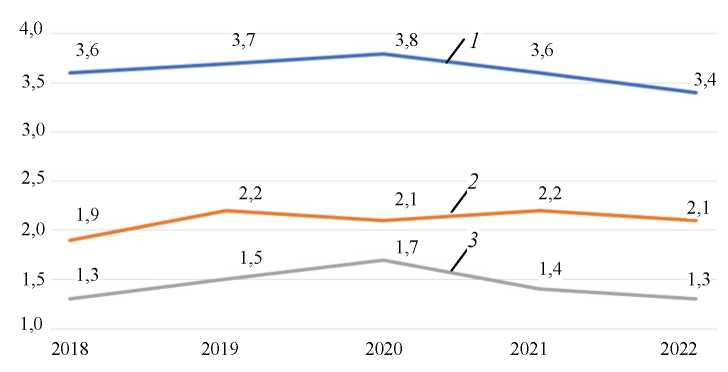 Сопоставляя динамику показателей на рис. 3 и 4 необходимо отметить, что тенденции затрат в абсолютном и относительном выражении совпадают. Незначительный рост доли валовых внутренних затрат на развитие цифровой экономики в ВВП (+0,1 п.п.) обусловлен превышением роста доли затрат домохозяйств (+0,2 п.п.) над сокращением внутренних затрат организаций (–0,1 п.п.) в 2020 году. Однако в 2021–2022 гг. доля затрат домашних хозяйств в ВВП снизилась относительно 2020 г., данная тенденция обусловила снижение доли валовых внутренних затрат на развитие цифровой экономики в 2021–2022 гг. Изменение доли внутренних затрат организаций в 2021 г. было положительным (+0,1 п.п.), но недостаточным для того, чтобы доля валовых внутренних затрат на развитие цифровой экономики также имела положительную тенденцию.