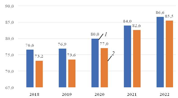 Рис. 5 Доступ к Интернету в домашних хозяйствах, % от общего числа домашних хозяйств: 1 – Интернет; 2 – широкополостной Интернет