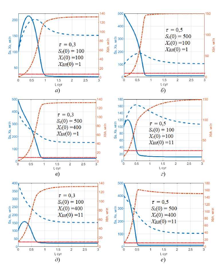 Программа организации вычислений на основе (1) – (3) в целях репрезентативности строилась по схеме двухуровневого полного факторного эксперимента (ПФЭ) [4]. В качестве входных варьируемых переменных выбраны: среднее время пребывания частиц жидкости НRТ Î [0, 3; 0, 5] и начальные концентрации Ss(0) Î [100; 500], Xs(0) Î [100; 400] и XBH(0) Î Î [1; 11]. В данном вычислительном эксперименте использовались следующие значения переменных: bА = 0,18; bH = 0,62; fp = 0,08; kh = 3; KOH = 0,5; Kx = 0,03; SNO = 100; KNO = 0,5; SO = 2; Ss,in = 300; XBА = 620; XBH,in = 5; Xs,in = 200; YH = 0,4; = 0,6;t = 0,5; hg = 0,8; hh = 0,4. Переменными отклика являлись расчетные значения концентрации Ss(t), Xs(t) и XBH(t) на выходе из аэротенка. Часть полученных решений приведена на рис. 1, а – е.