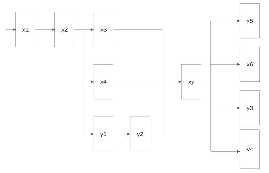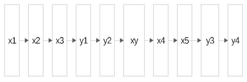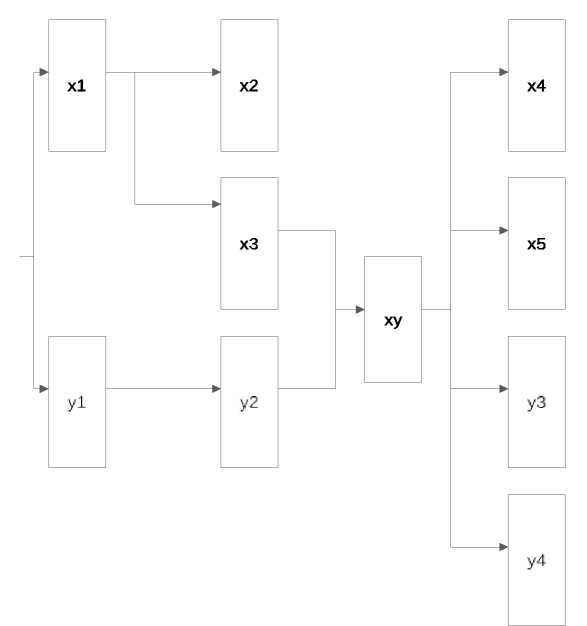 Рассмотрим поток различных сообщений, приходящих в микросервис. Данные сообщения относятся к одной доменной области, однако при этом должны быть обработаны различным образом. Возможна ситуация, когда порядок обработки сообщений может влиять на результат. Рассмотрим последовательность сообщений, представленных на рис. 3. В данной последовательности мы предположили, что сообщения x1, x2, x5 влияют на состояние некоторого разделяемого ресурса X1, x3 на X2, а x4 на X3 и X2, причем X1 является родительским ресурсом для X2 и X3. Сообщения y1 на Y1, y2, y3 на Y2, а y4 на Y3, причем состояние Y1 является родительским для Y2 и Y3. Сообщение xy изменяет состояния X1 и Y1.