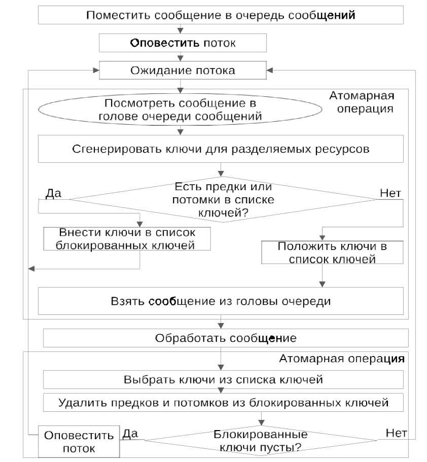 Помимо очереди сообщений, предлагаемый алгоритм использует список ключей и список блокированных ключей. Ключи, определяющие ресурсы, блокированные сообщениями, которые в данный момент обрабатываются многопоточной системой, помещаются в список ключей. В очереди сообщений находится сообщение, являющееся претендентом на обработку. Когда у нас появляется очередной свободный поток, он просматривает голову очереди сообщений и генерирует ключи для претендента на обработку. Далее мы проверяем, находятся ли в списке ключей предки или потомки данного ключа. Если они там находятся, то ключ помещается в список блокированных ключей. Несмотря на то, что рассматривается только одно сообщение в качестве претендента на обработку, мы используем список блокированных ключей, т.к. сообщения могут генерировать более одного ключа. В случае, если нет ни одного ресурса, который уже используется и необходим для обработки данного сообщения, ключи сообщения заносятся в список ключей, и сообщение обрабатывается. Если же конфликт доступа к ресурсам обнаружен, то поток будет находиться в состоянии ожидания. После окончания обработки сообщения все связанные с этим сообщением ключи удаляются из списка ключей и списка блокированных ключей. Если в списке блокированных ключей нет больше записей, значит, следующее сообщение готово к обработке. В алгоритме присутствуют две области кода, которые должны выполняться атомарно. Первая область начинается с просмотра сообщения в очереди и заканчивается перед обработкой сообщения. Вторая начинается после обработки сообщения и заканчивается проверкой блокированных ключей. Таким образом, только обработка сообщения выполняется многопоточно.