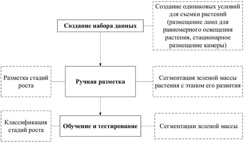 В рамках работы выполнялась категориальная разметка изображений, каждое из которых оценивалось на соответствие определенному классу стадии роста – всходы, рассада и первый настоящий лист; разметка выполнялась экспертом-агрономом на основании качественных визуальных признаков, характерных для каждой стадии роста. Полученный набор данных был разделен на обучающую и тестовую выборку. Процесс аннотации собранного набора данных был проведен в программе Labelme [19].