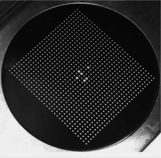 В данном исследовании был выполнен эксперимент на принтере, использующем технологию СЛП, модели «Наука3D/21 СЛП-150». Для сбора данных использовалась камера Daheng MER2-2000-19U3M с разрешением 5496 × 3672. Калибровка параметров камеры производилась с использованием пластины Edmund Optics 100 x 100 мм, 2.0mm spacing, glass distortion target. Ошибка расчета матрицы камеры составила 0,14 пикселей. В качестве подложки для прожига паттерна использован стеклянный круг с радиусом, равным радиусу платформы, на который была нанесена самоклеящаяся черная глянцевая бумага (рис. 4). Область прожига была равна 110 × 110 мм, размер сетки паттерна равнялся 31. После завершения процесса калибровки сетка была прожжена повторно, и итоговая ошибка составила 0,018 мм.
