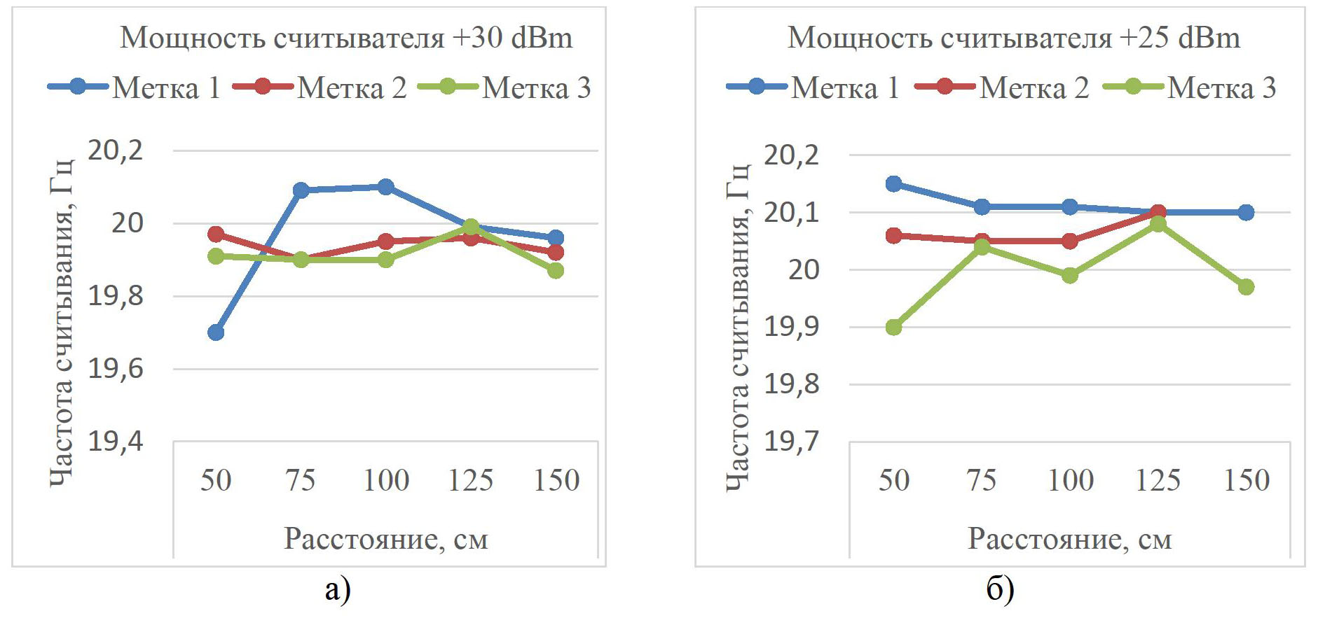 Рис. 7. Частота считывания меток при мощности считывателя: а) +30 dBm; б) +25 dBm