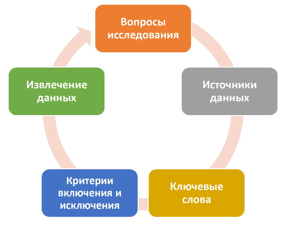 Для проведения систематизированного анализа была разработана методология, включающая в себя пять этапов: вопросы исследования, источники данных, ключевые слова, критерии включения и исключения, извлечение данных (рис. 1).
