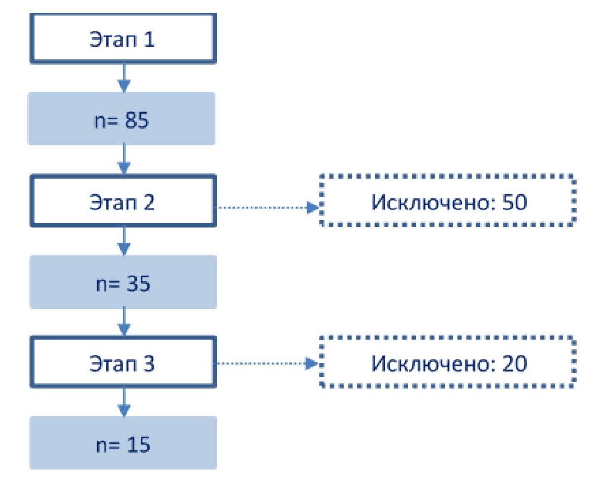 На первом этапе был проведен поиск исследований по выбранным источникам данных и извлечение названий, в результате чего было получено 85 исходных исследований. На втором этапе на основе анализа названий были определены потенциальные исследования, из которых было исключено 50, в результате чего 35 исследований были использованы на следующем этапе. Последний этап состоял из чтения аннотации, введения и результатов с использованием критериев включения и исключения. 20 исследований были исключены, а 15 использовались для извлечения релевантной информации. Большинство проанализированных исследований были опубликованы в 2023 году (n=6) и в 2020 году (n=5), за ними следуют 2021 и 2024 годы – по 2 исследования. На рисунке 2 показано, как осуществлялся процесс отбора.