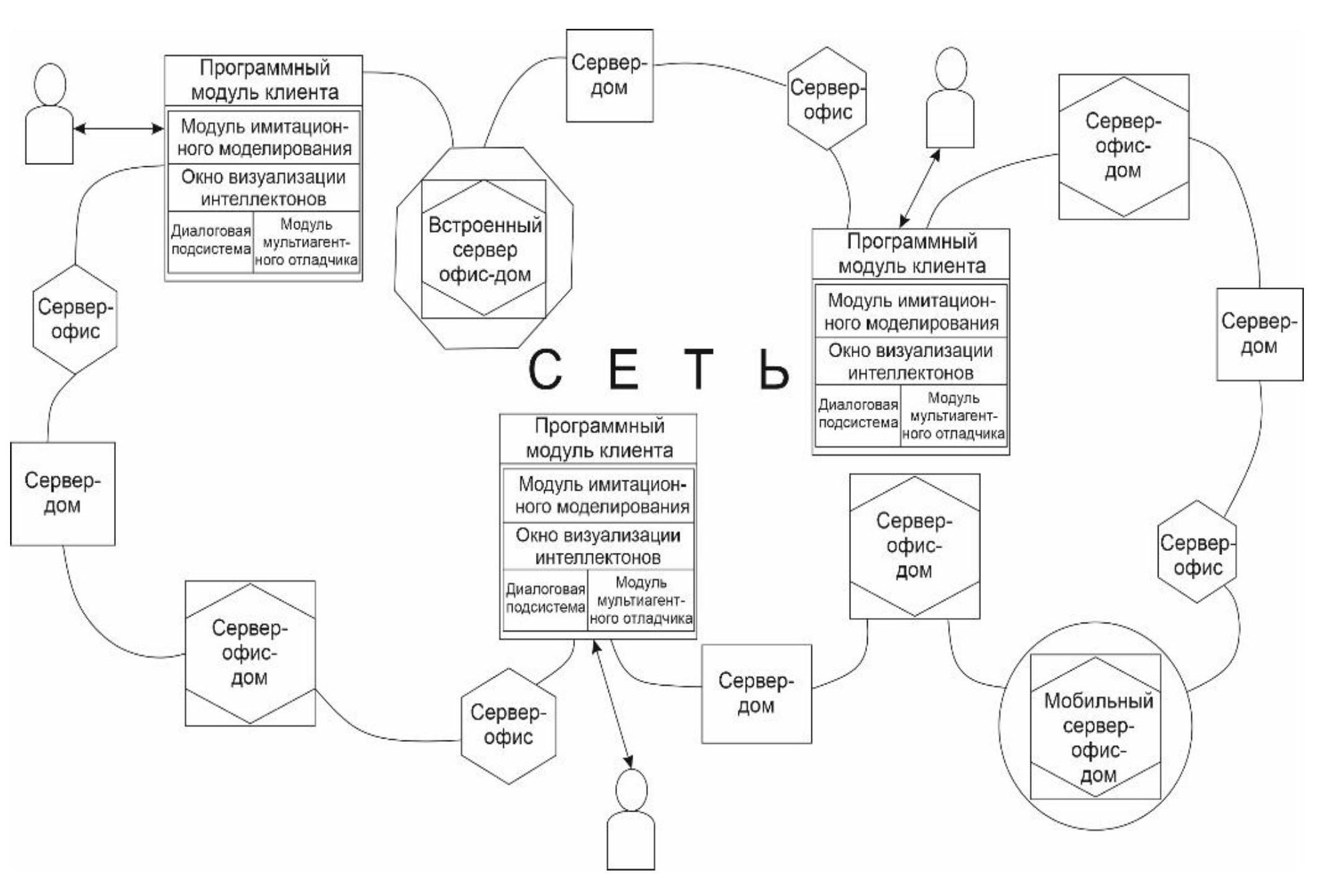 Из рисунка следует, что нейрокогнитивные агенты базируются на логических серверах, представляющих собой специализированные функциональные узлы глобальной сети. Интеллектуальные агенты используют специфическую метафору хранения и применения. Логические сервера, применяемые для реализации задач назначения, называются серверами-офисами. Логические сервера, на которых хранятся, называются серверами-домами.