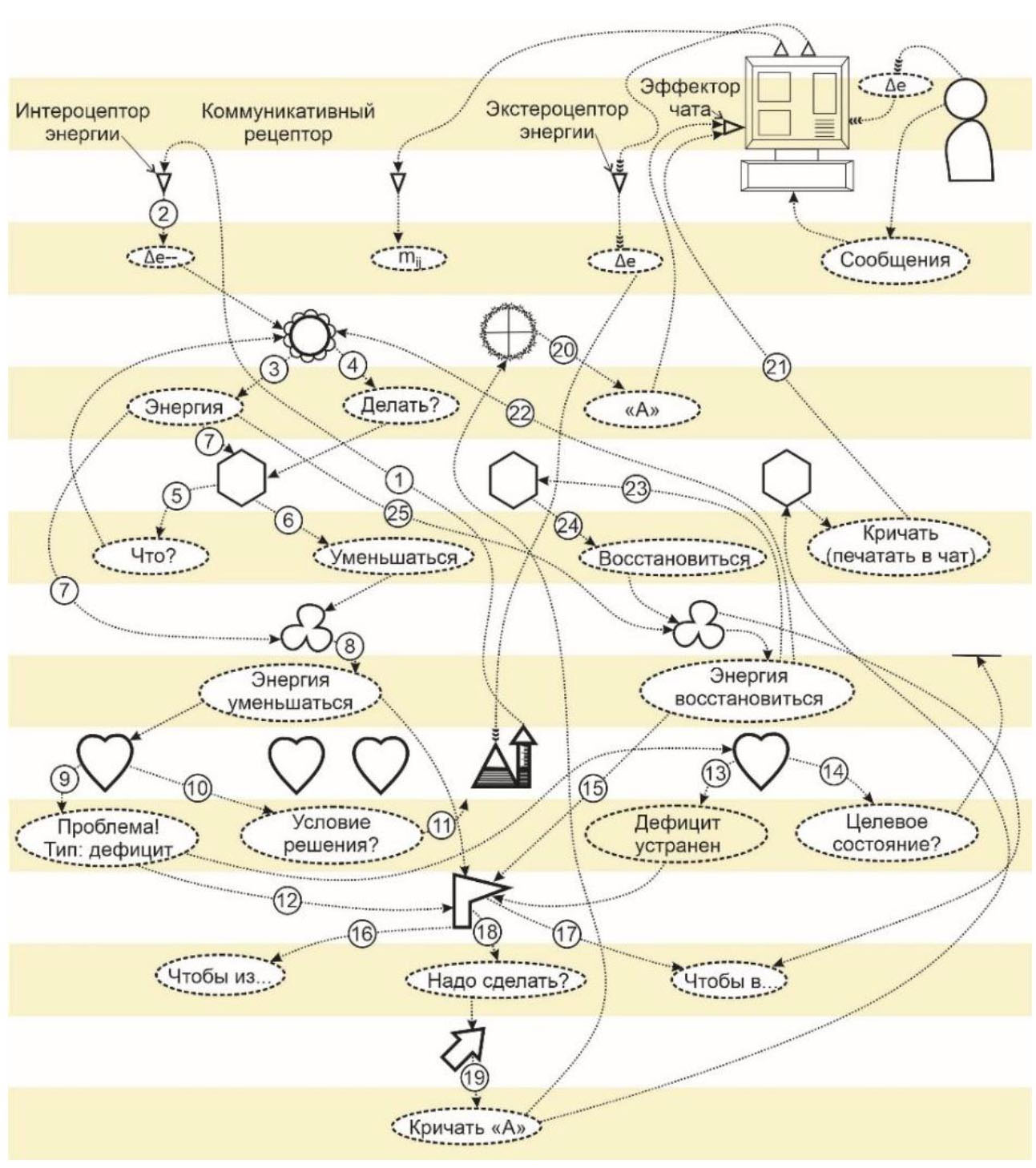 Схема логической организации базового интеллектуального нейрокогнитивного агента (интеллектона), управляющего поведением имитационной модели условной мезамасштабной клетки растения [10], дана на рис. 3.